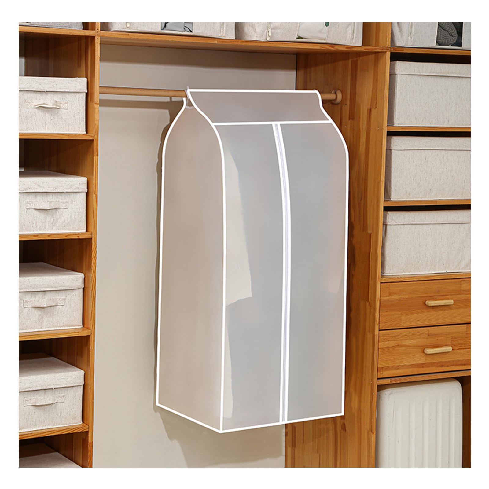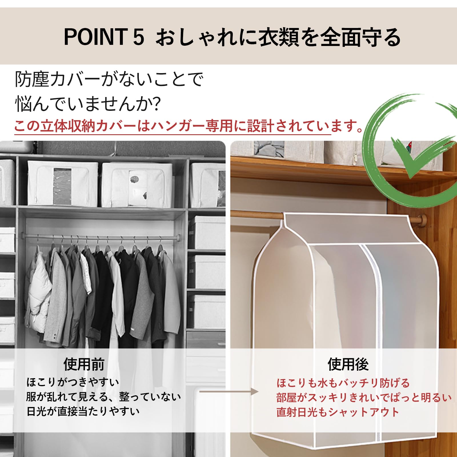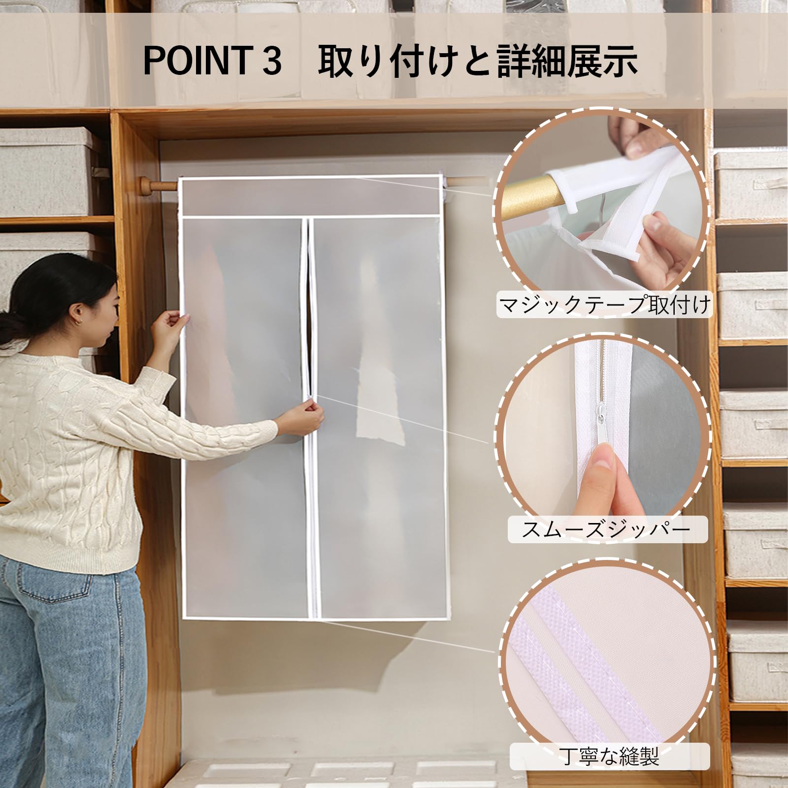 【全面ガード】立体収納カバーで、クローゼットもお部屋も整理整頓がラクチン。ごちゃごちゃクローゼットでもサッと収まる!季節ものもまとめてポイっと入れちゃう大容量デザイン。上部はマジックテープでパカッと開閉、ハンガーやラックにサッと取り付けられるから、面倒な作業もなし!ジッパー式でスルスル開閉できる、すっぽりカバータイプの衣類カバーです〜ホコリ・湿気・虫・カビ・ニオイをブロック。衣類を縦掛けで収納すると、しわが発生せず、新品同様の清潔さを保ちます。お部屋をスッキリさせたい方にピッタリのアイテムです!