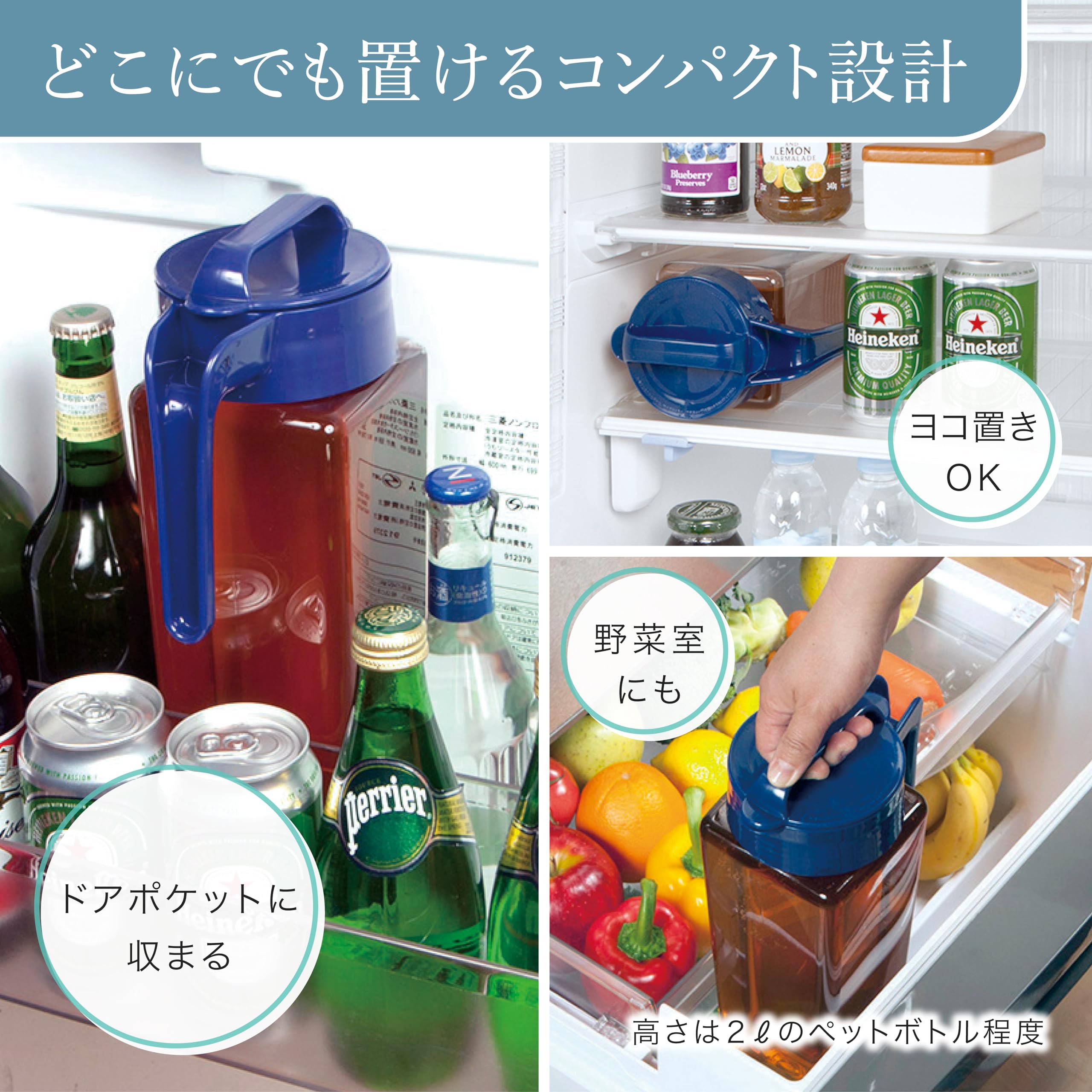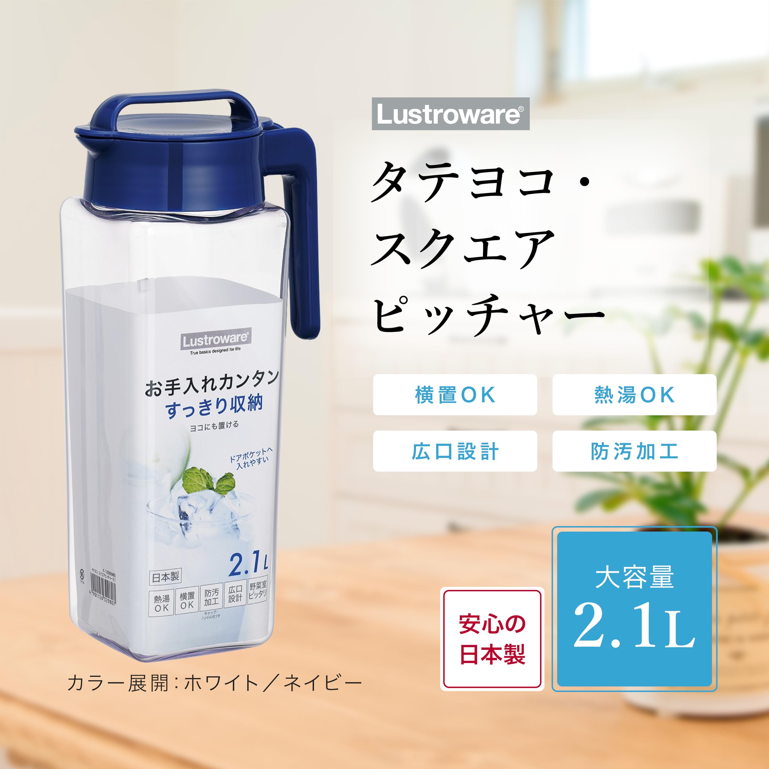 【在庫処分】岩崎工業 ラストロウェア スクエア ピッチャー 冷水筒 耐熱 縦横置き 2.1L 日本製 麦茶ポット 冷茶 ボトル 冷水 お茶ポット 水出し 水出しコーヒー ウォーター ジャグ 横置き 広口 マリンブルー K-1298 MB