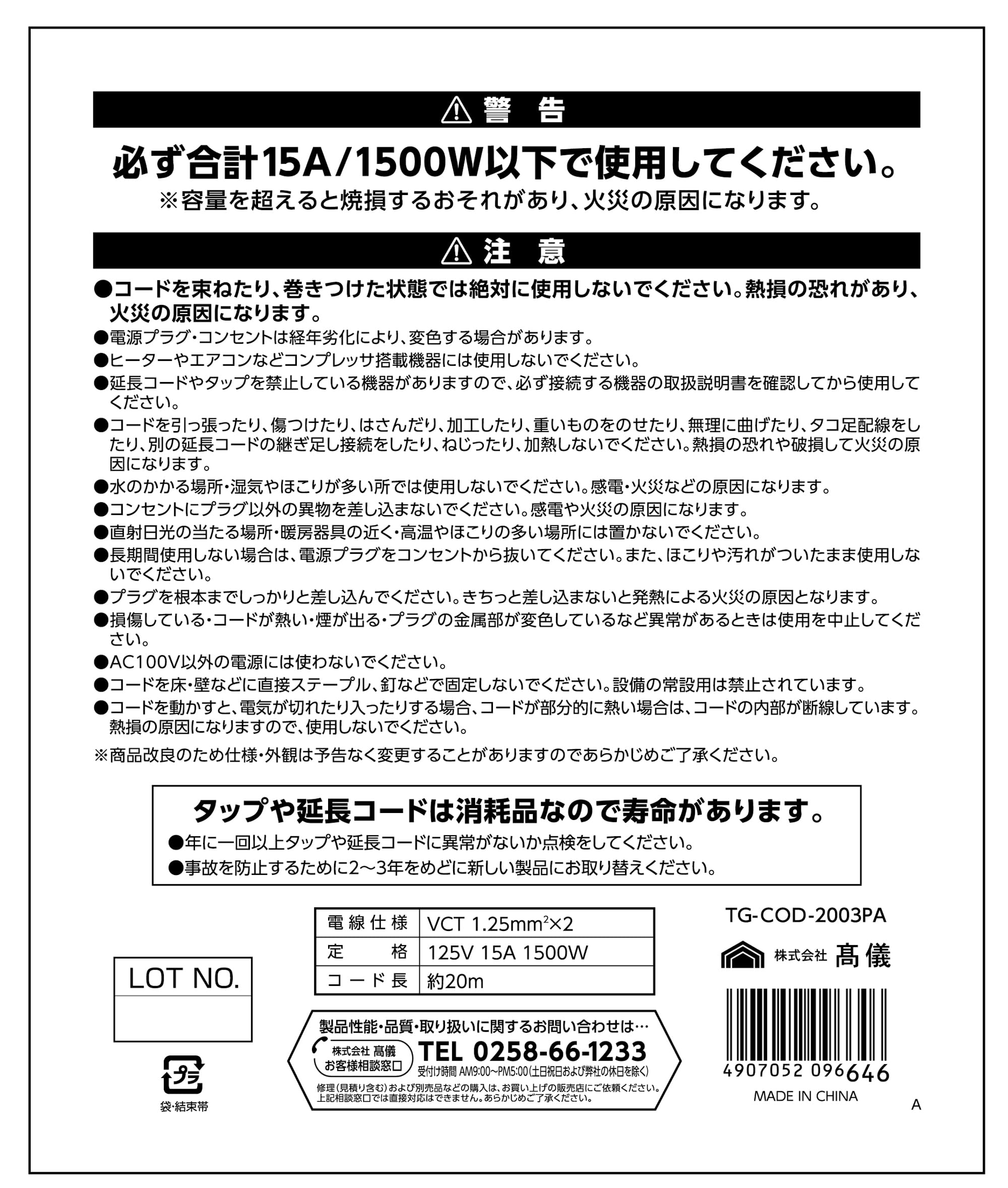 【新着特価】高儀(Takagi) M.M 延長コード 電源タップ トリプルタップ コンセント 電源ケーブル 延長ケーブル 電源コード 延長電源 作業用 カラー 3口 ソフトタイプ 1500Wまで 125V 15A 3個口 3分配 紫 コンセント たこあし 電工 20m パープル TG-COD-2003PA
