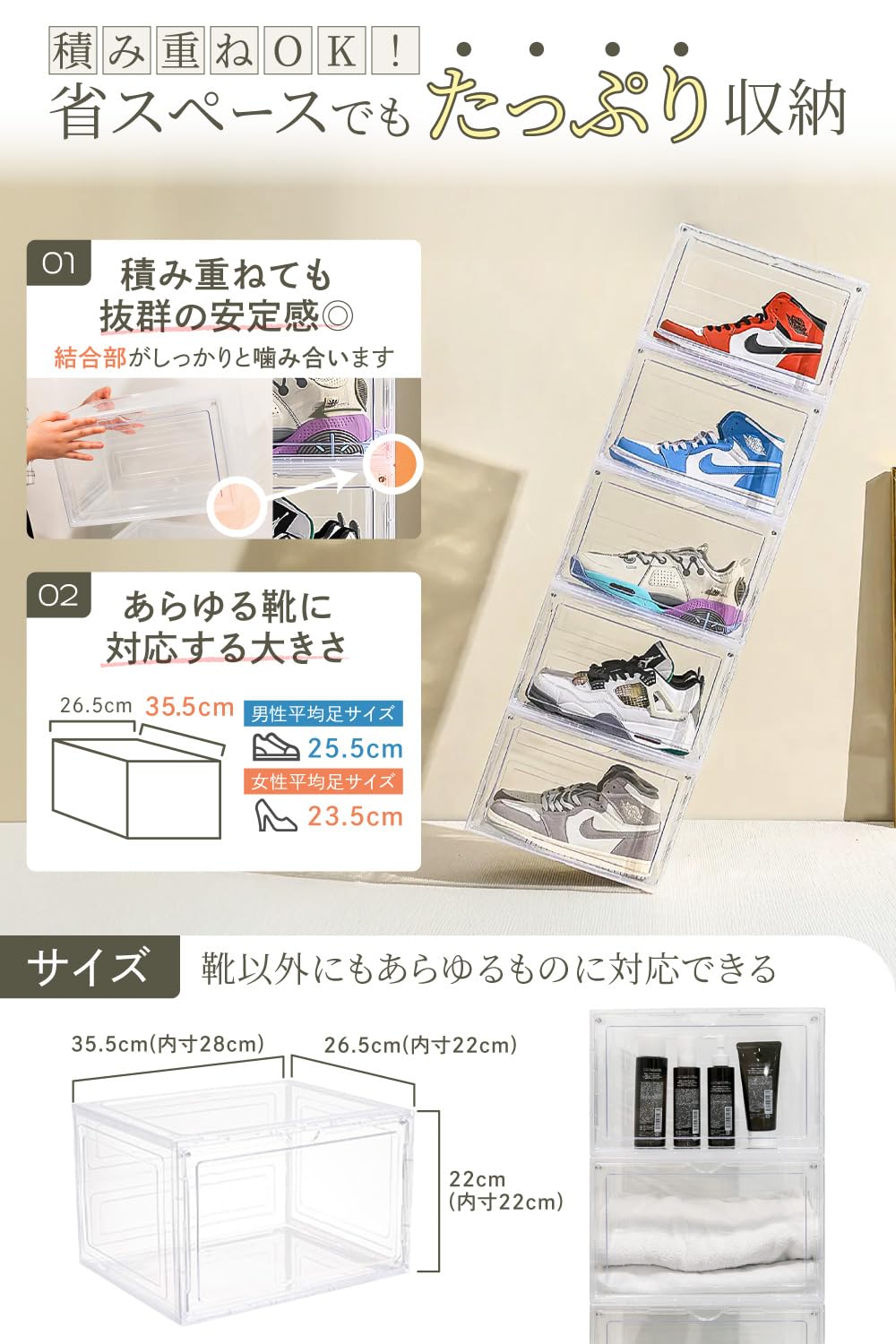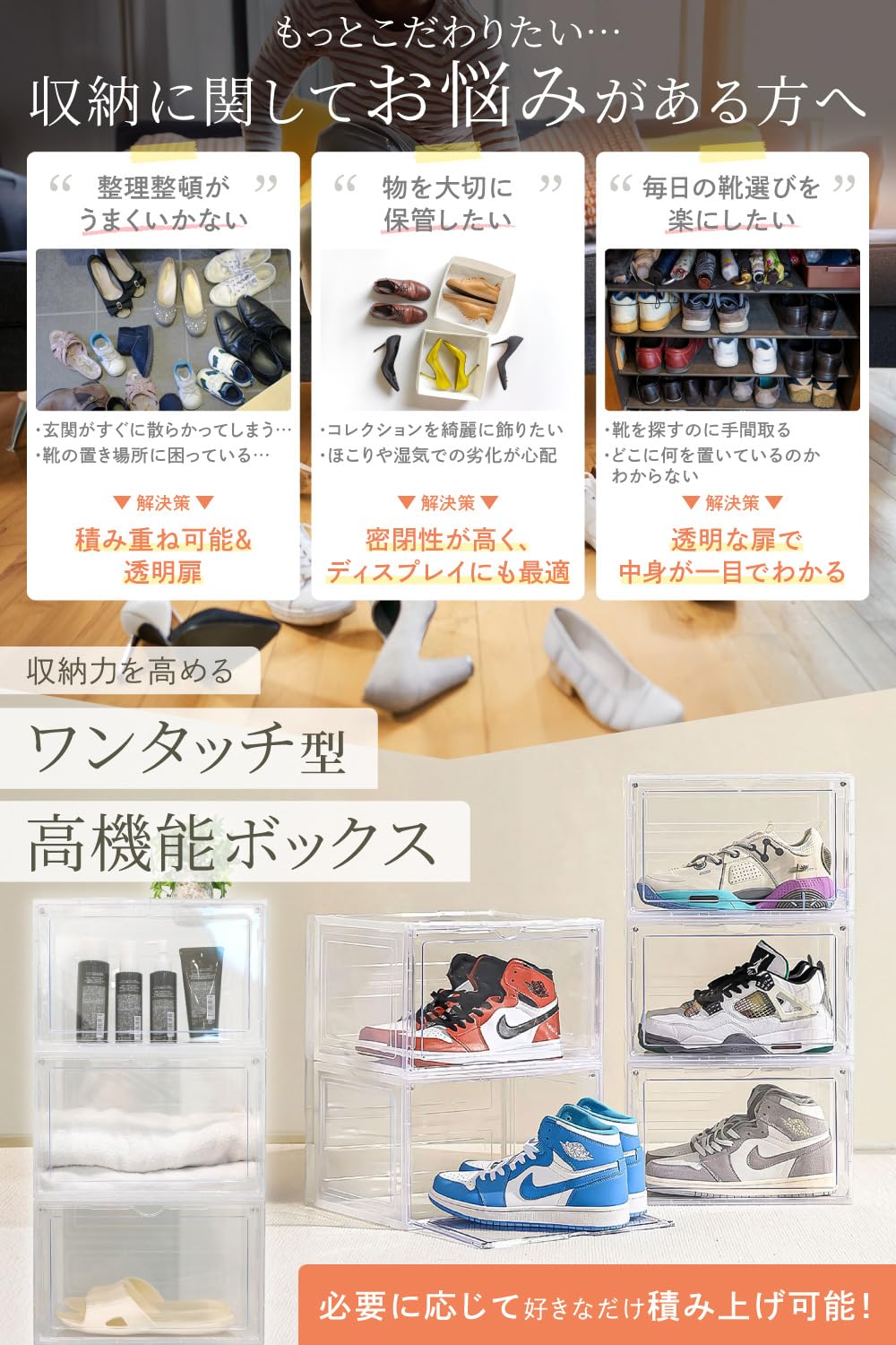?【積み重ねできる省スペース設計】 縦にも横にも積み重ねられる構造により、収納効率が大幅に向上。限られた空間を有効活用しながら、すっきりと整理整頓ができます。玄関の靴箱スペースやクローゼット内、趣味部屋のディスプレイ棚などにも対応可能なマルチシューズボックスです。