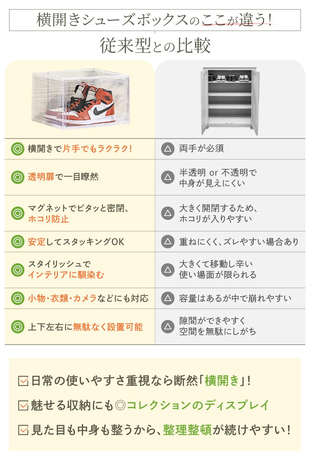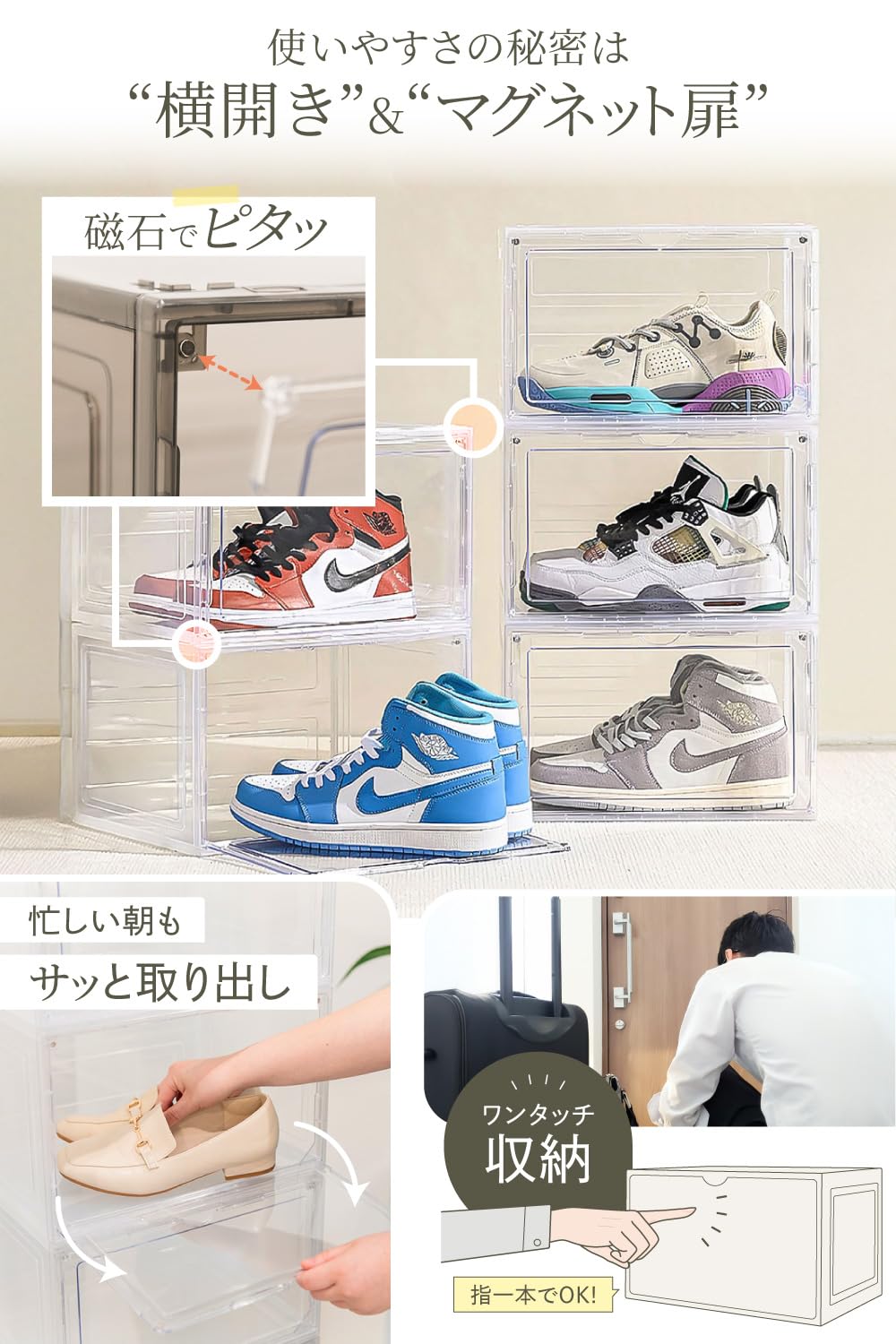 ?【側面扉で靴の出し入れが簡単】 上に重ねた状態でもストレスなく靴を取り出せる、側面扉を採用。マグネット式なので、片手でも開閉できるスムーズな構造で、忙しい朝でもサッと取り出し可能です。積み重ね収納でも、取り出しやすさと使い勝手を両立するスニーカーケースです。