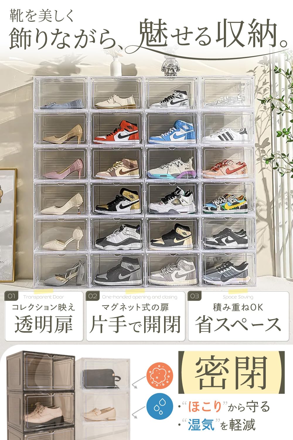 ?【透明クリア素材で魅せる収納を実現】 スニーカーやお気に入りの靴を、“魅せる収納”として活用できる高透明のシューズケース。シンプルかつ美しいデザインで、靴のカラーやデザインが外からもはっきり見えるので、スマートに選べるシューズボックスです。