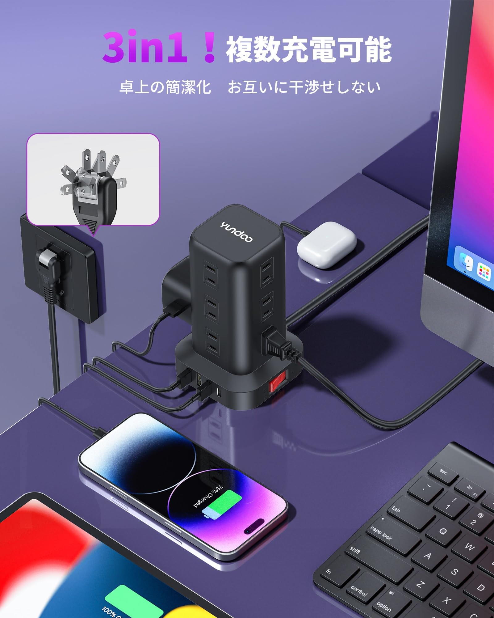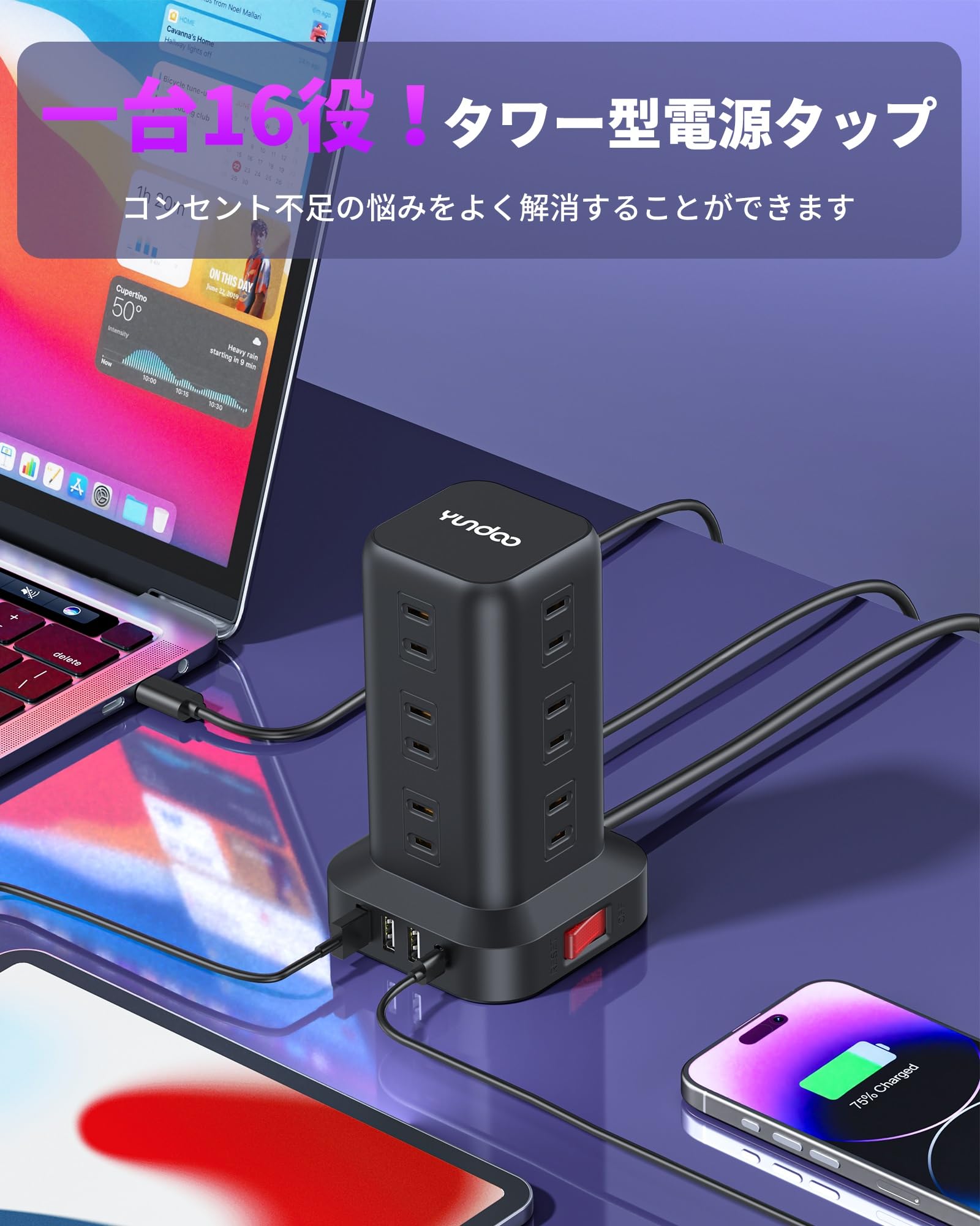 【3in1!一台16役で複数充電可能&延長コード】YUNDOOタップはACコンセント12口、USBポート3口、Type-Cポート1口が搭載しており、一度にパソコンやOA機器やスマホやタブレットなど複数の機器に給電、充電することが可能です。最大16台まで同時に給電・充電可能。電子機器やパソコン周辺機器が多い場合におすすめです。また、延長コードは2mのタイプので、お部屋のコンセントから離れた場所でも電源を確保して電気機器を使用できます。さらに、3in1と2m延長コードデザインで、外出時の携帯性はもちろん、オフィスや自宅でのデスクが一気にすっきり!