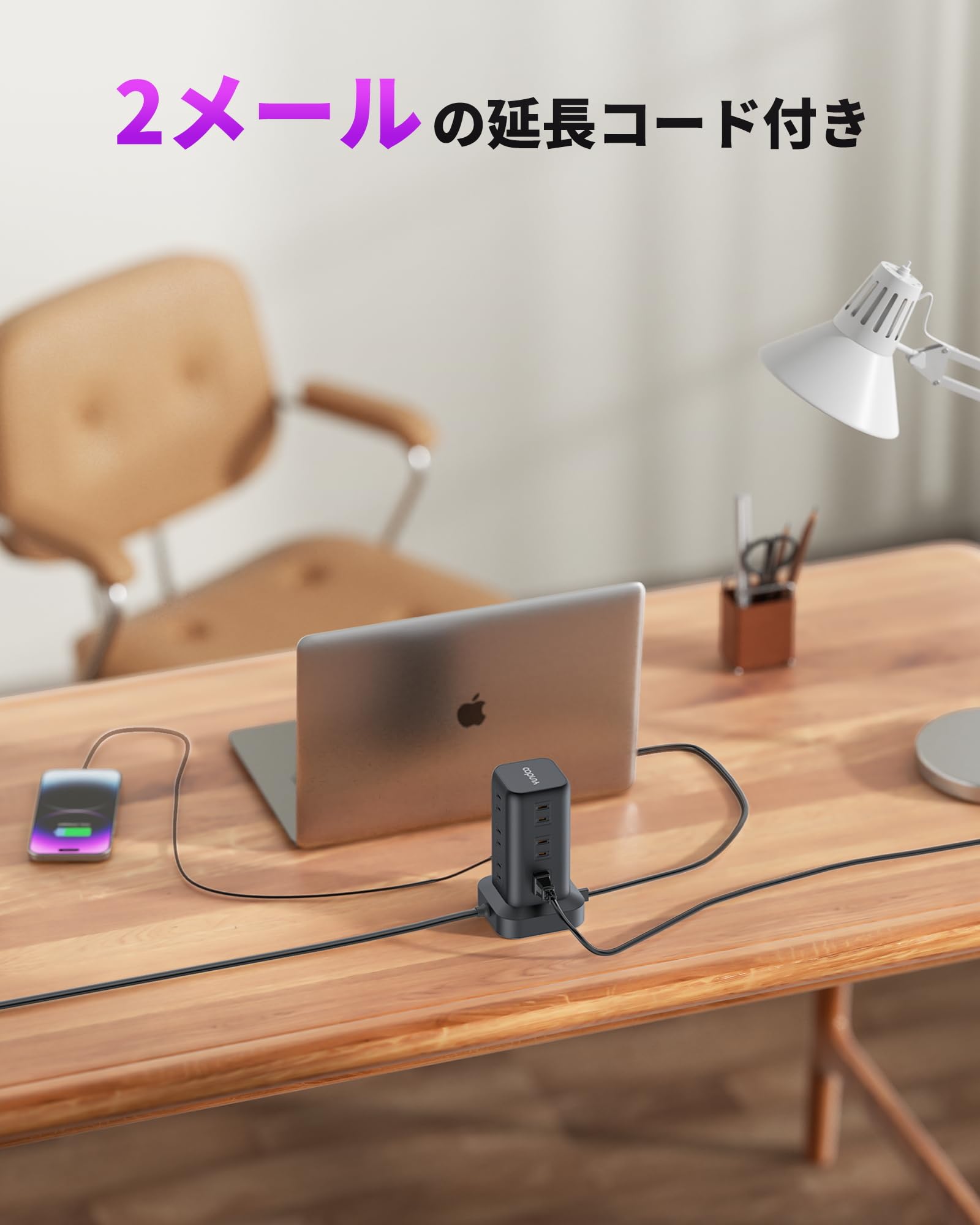 【横向き設計でホコリ&ケーブル負荷を軽減! 独自の防塵デザイン電源タップ】ACコンセントとUSBポートを横向きに配置することで、縦型タップに比べホコリの堆積を抑制。重力を活かした構造で、端子内部の汚れを軽減します。そして、USBケーブルや電源プラグを自然な角度で差し込めるため、線材の折れや接続部の破損リスクを低減。長く快適にご利用いただけます。ご注意:本製品には防塵扉は付いていません。