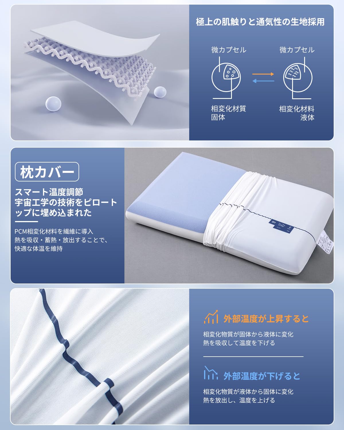 ?【スマート温度調節できる枕】枕カバーは宇宙技術を採用し、PCM相変化材料を繊維に導入します。体温に反応して、暑いときには熱を吸収し、涼しいときには熱を放出して、快適な睡眠環境を提供します。