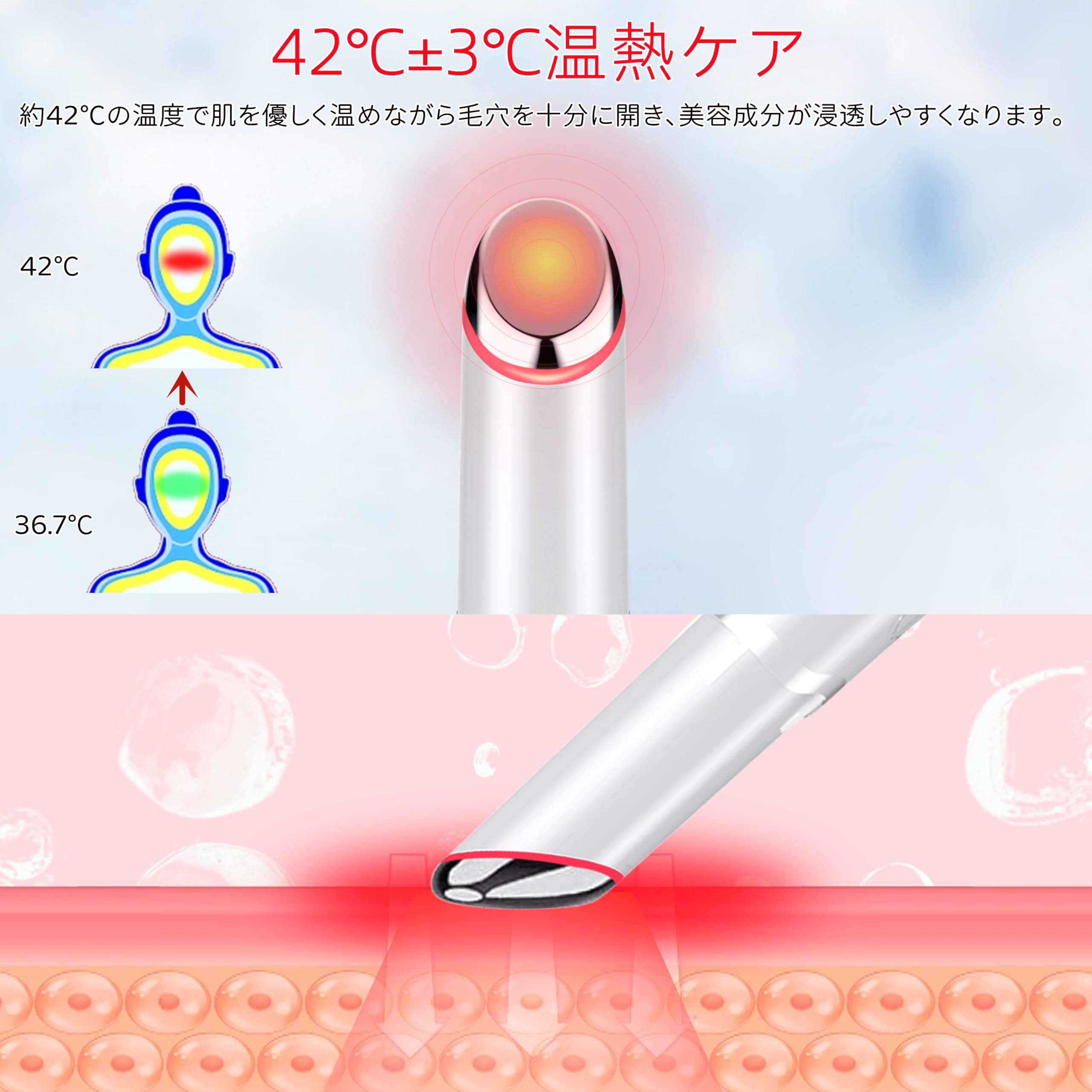 【音波振動・温熱ケア】この目元ケア美顔器は、高頻度振動と42℃±3℃の温熱機能が1分間に約12000回で、目元や気になる箇所に心地よい刺激を提供致します。御自宅使用に最適で、毎日の美容習慣におすすめ。