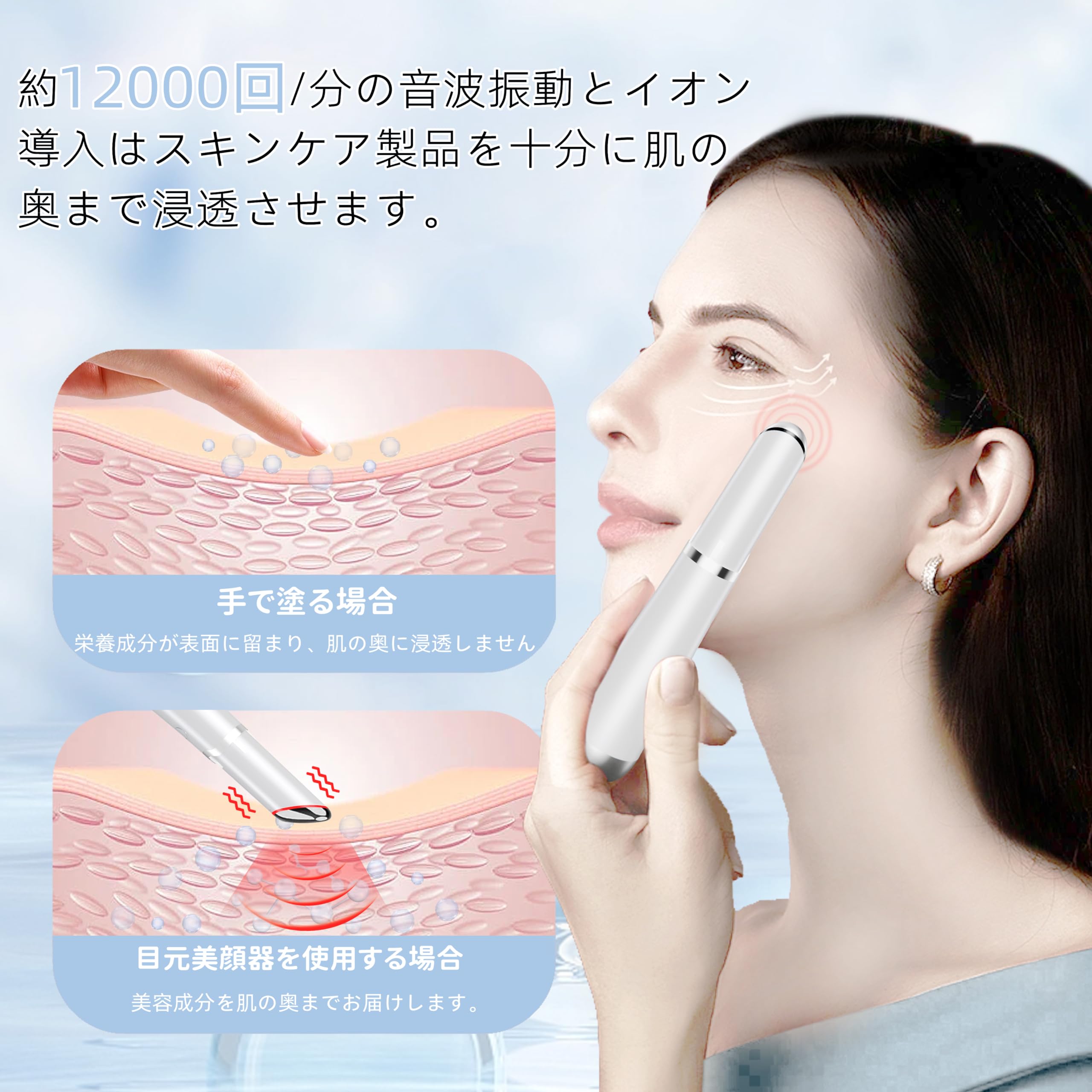 【栄養導入】小さなヘッドが目元&口元の細部にアプローチ。イオン誘導で潤いを与え、美容成分を肌の深層まで浸透させ吸収させ、目もとが輝く美しさへ導きます。