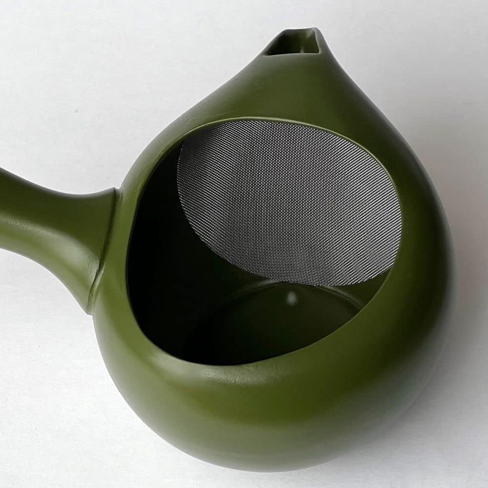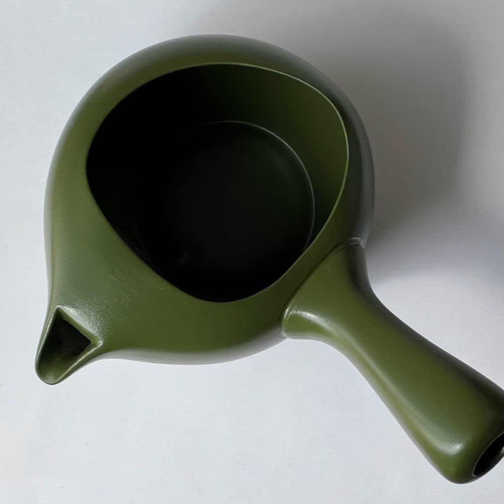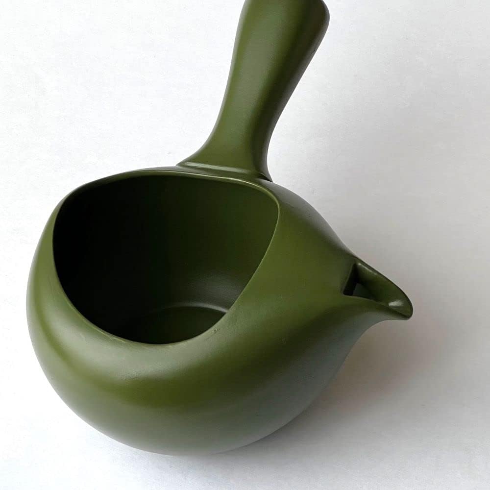 【つや消しの深い緑がおしゃれ、茶器らしい雰囲気があります】常滑で「ちゃーみる」と呼ばれるフタ無し急須。深蒸し茶にも対応の高性能、片手で楽々使えます。持ちやすさ使いやすさを追求した機能型急須。少し長めに設計された持ち手、茶葉を取り出しやすく茶湯がこぼれにくい構造です。慣れてくると意外に快適、用途の広い「フタ無し急須」。冷茶・水出し茶用急須としてもおススメします。