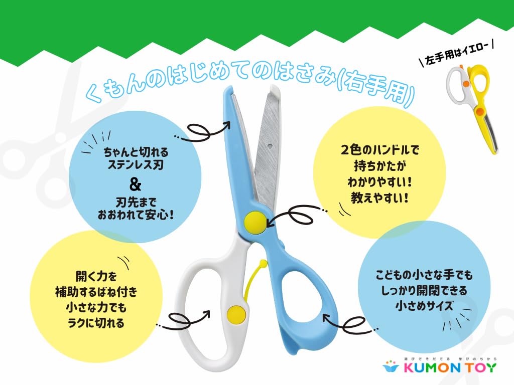 「くもんのはじめてのはさみ」は幼児がはじめて使うのに適したはさみです。補助ばねではさみを開く力をサポートし、しっかり切れるステンレス刃を採用しています。また、刃先までしっかり覆われているので安全に使用できます。はさみの使いかたがわかるミニガイド付