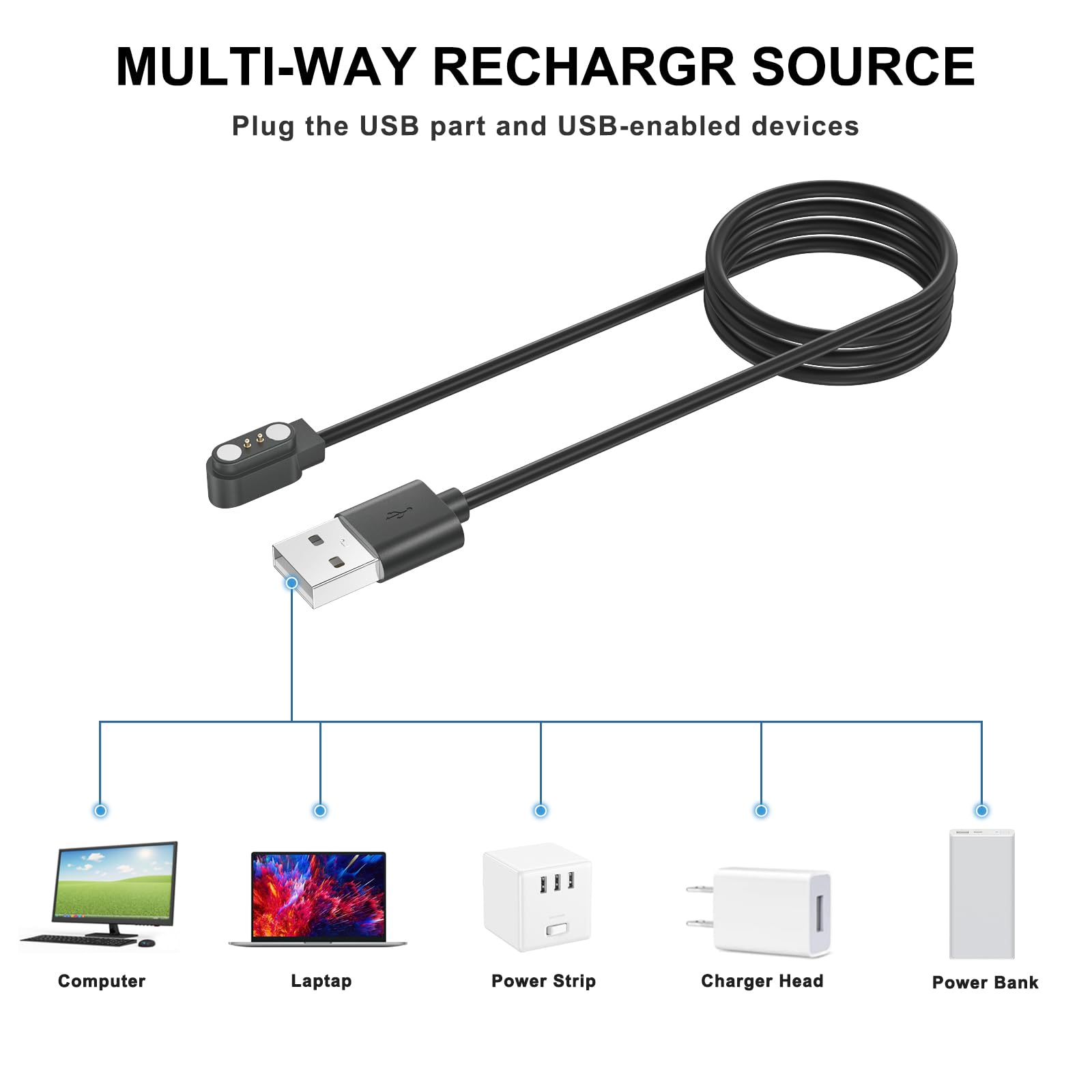 スマートウォッチ充電器 2 ピン距離 2.84 mm USB磁気充電ケーブル 1M Letsfit Willful VeryFitPro SW021 SW023 SW025 ID205L ID205U ID205S ID206 ID216 Uwatch 3S 3 2 2S に適しています (1M)