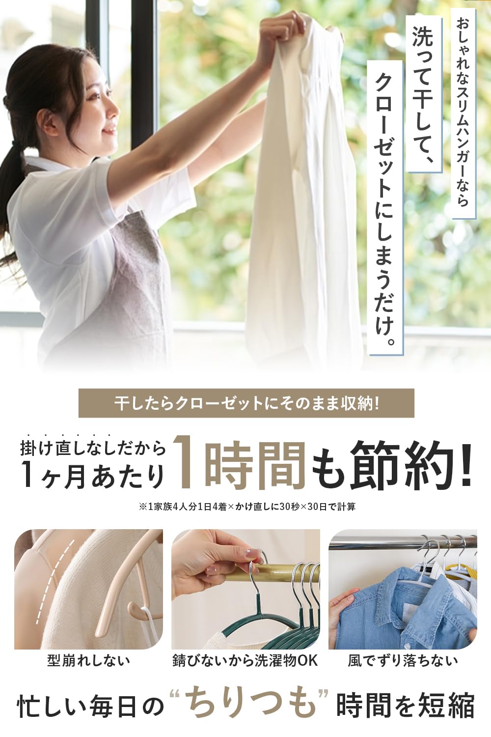 ?【省スペース設計ですっきり収納】厚さわずか1cmのスリムな設計で、クローゼット内の収納力を大幅アップ。洗濯干しにも使えるハンガーなので、乾いた後はそのままハンガー収納して時短もできます。 統一されたすべらないハンガーで限られた収納スペースを活用しながら整理したい方にも最適な、かたくずれ防止 ハンガーです。