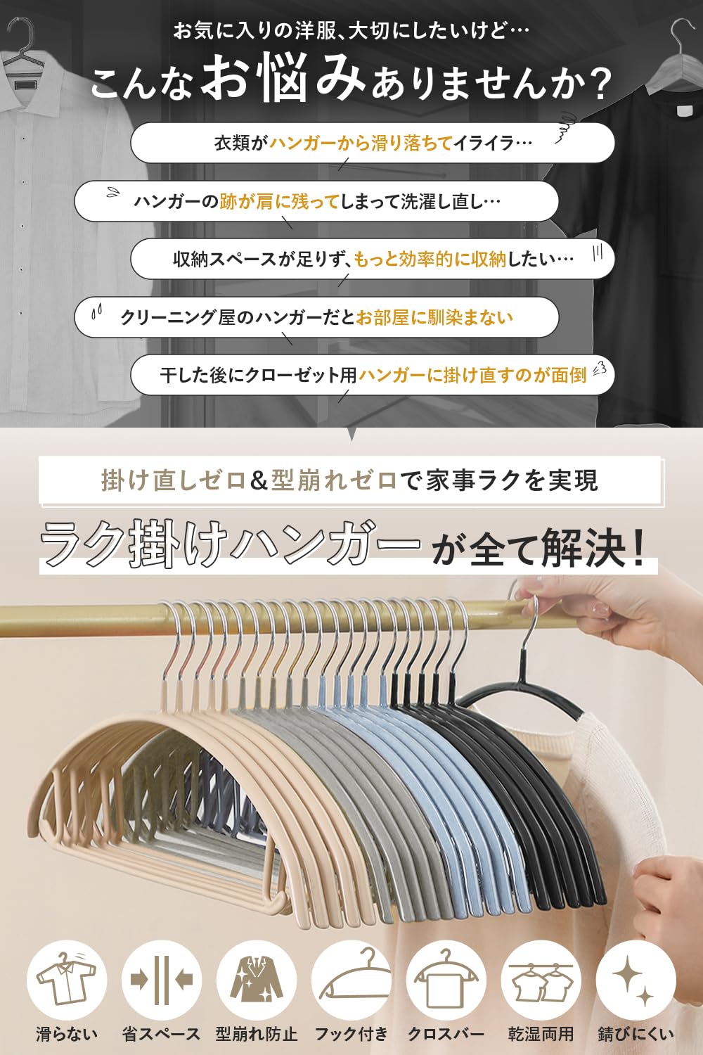?【滑り止め加工で衣類をしっかり固定】PVC加工により、シルクやリネンといった滑りやすい素材の衣類もしっかり固定可能。すべらないハンガー(スーツハンガー)として、洋服の落下によるストレスを軽減します。薄手の衣類から厚手のアウターまでオールシーズンご使用いただけるかたくずれ防止タイプの滑らないハンガー セットです。