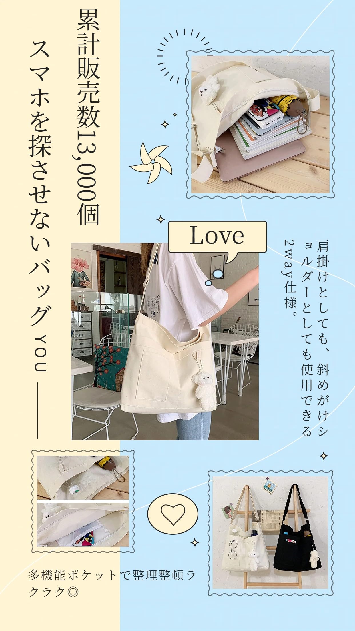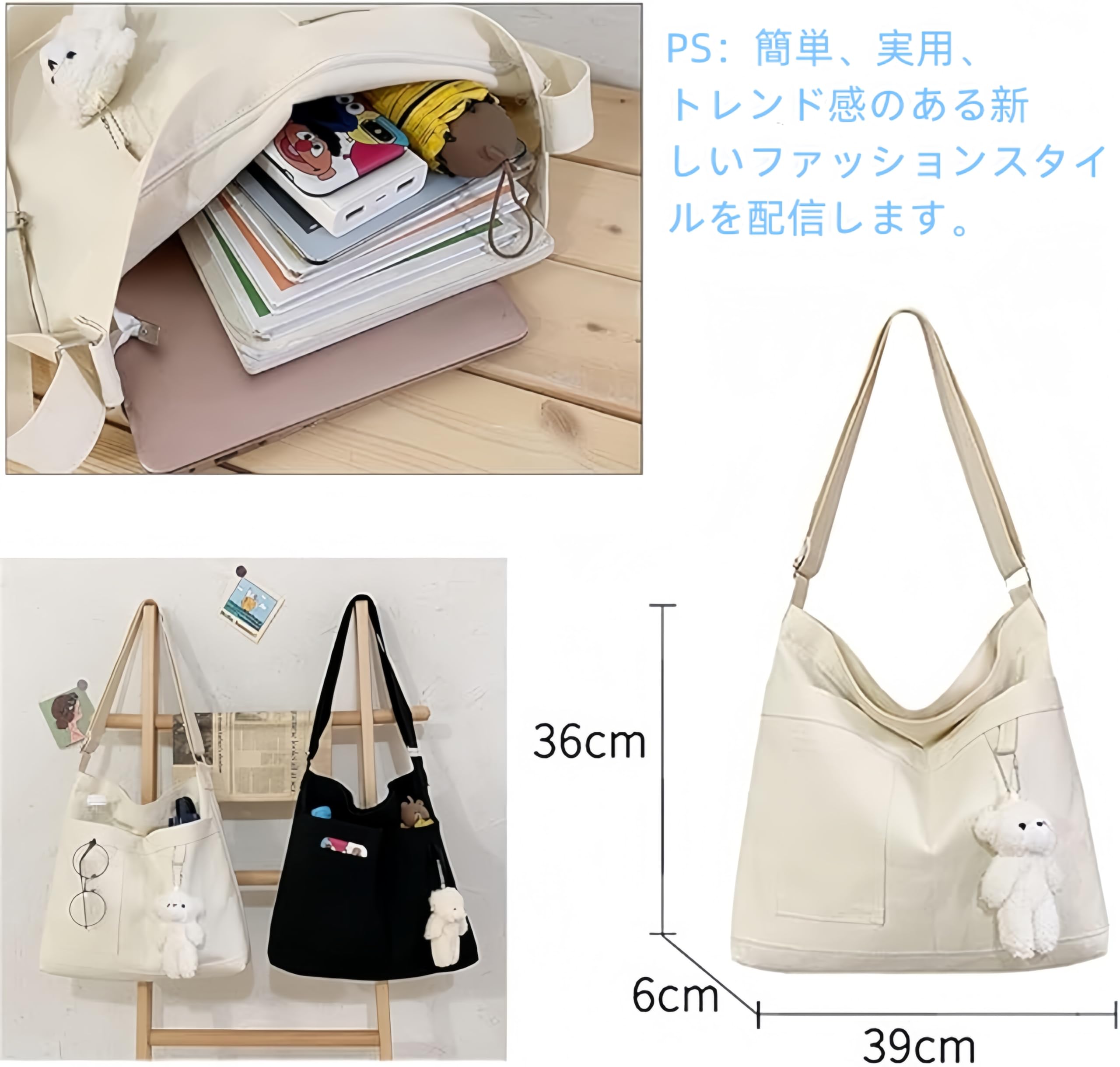 ミニマリズムとスポーツカジュアル:トートバッグとしても、肩紐の長さが調節できるので、お好きなスタイルでご使用いただけます。ショルダーバッグ、斜め掛バッグ、ハンドバッグ、ビーチバッグ、通勤バッグとして完璧に使用されています。注意:キャンバスバッグのぬいぐるみペンダントは含まれていません。