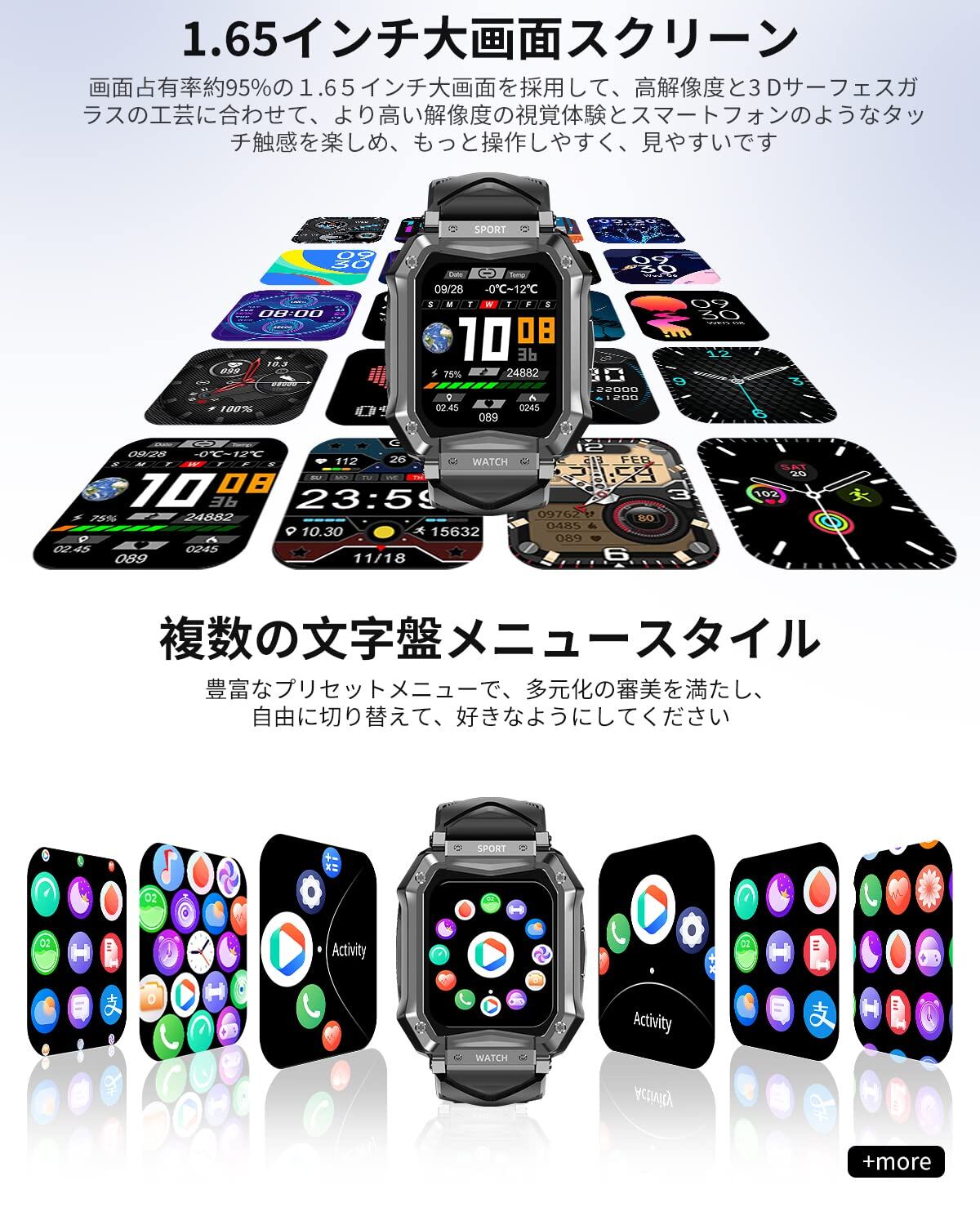 【耐衝撃&IP68防塵防水&軍用規格スマートウォッチ】 ★スマートウォッチは1.65インチ全画面タッチパネルを採用し、画質がより鮮明になり、より高精度な大画面で文字を表示します。★スマートウォッチ本体は特殊な複合材料亜鉛合金+ABS素材の耐衝撃材料を採用され、MIL軍事規格に準拠しており、優れた耐低温、耐高温、耐衝撃、防水防塵などを備えています。。日常から過酷な自然環境まで、あらゆるシーンで適用されます。