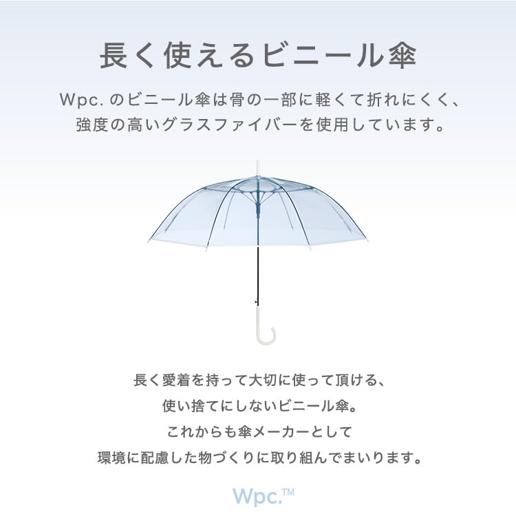 【長く使えるビニール傘】 Wpc.のビニール傘は骨の一部に軽くて折れにくく、強度の高いグラスファイバーを使用しています。 愛着を持って大切に長く使って頂ける、使い捨てにしないビニール傘です。