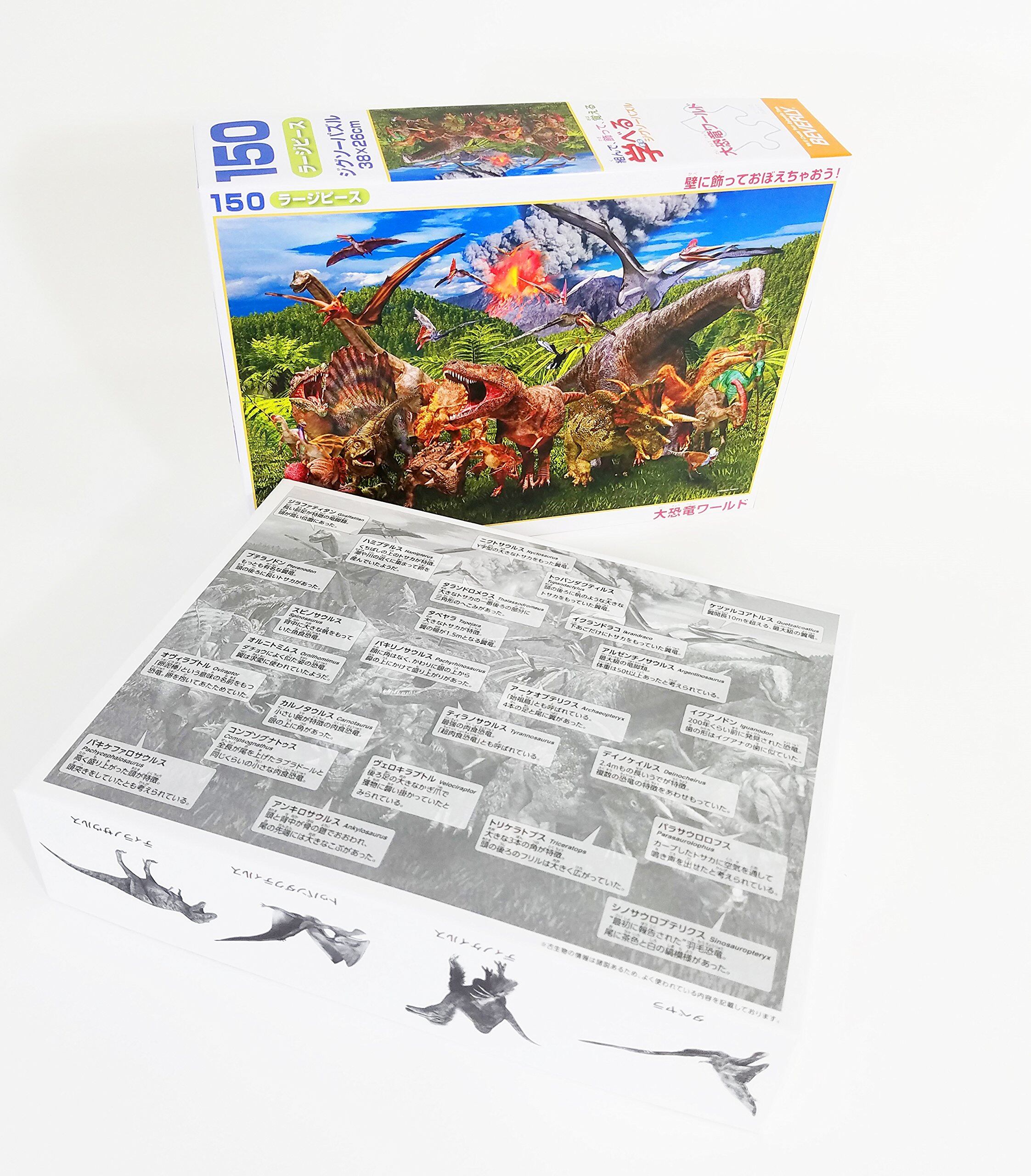 大迫力のアートで恐竜たちの生き生きとした姿が学べる!パッケージの裏面には絵柄に登場する恐竜を解説!!