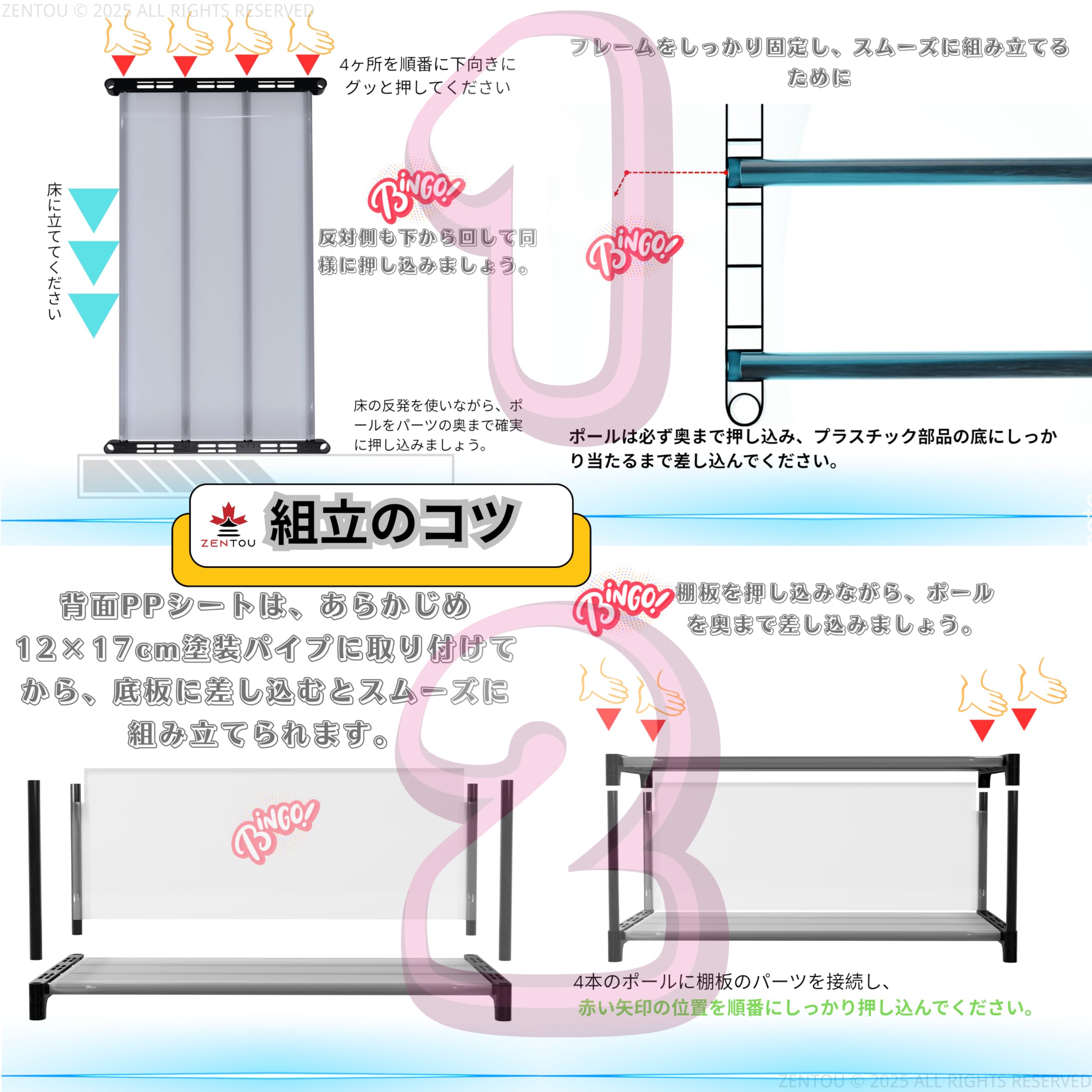 3. 簡単組立・工具不要のシューズラック スチールパイプ、PPジョイント、PPシートを使用し、工具不要で簡単に組み立てられます。女性一人でも付属の手袋で約10?20分で完成。何度でも分解・再組立ができ、模様替えや引っ越しにも便利です。靴しゅうのう 玄関、靴棚、靴箱 上収納、くつばこスリム 玄関、シューズ収納 大容量、省スペース 靴箱、シューズ ラックとしても活用可能です。