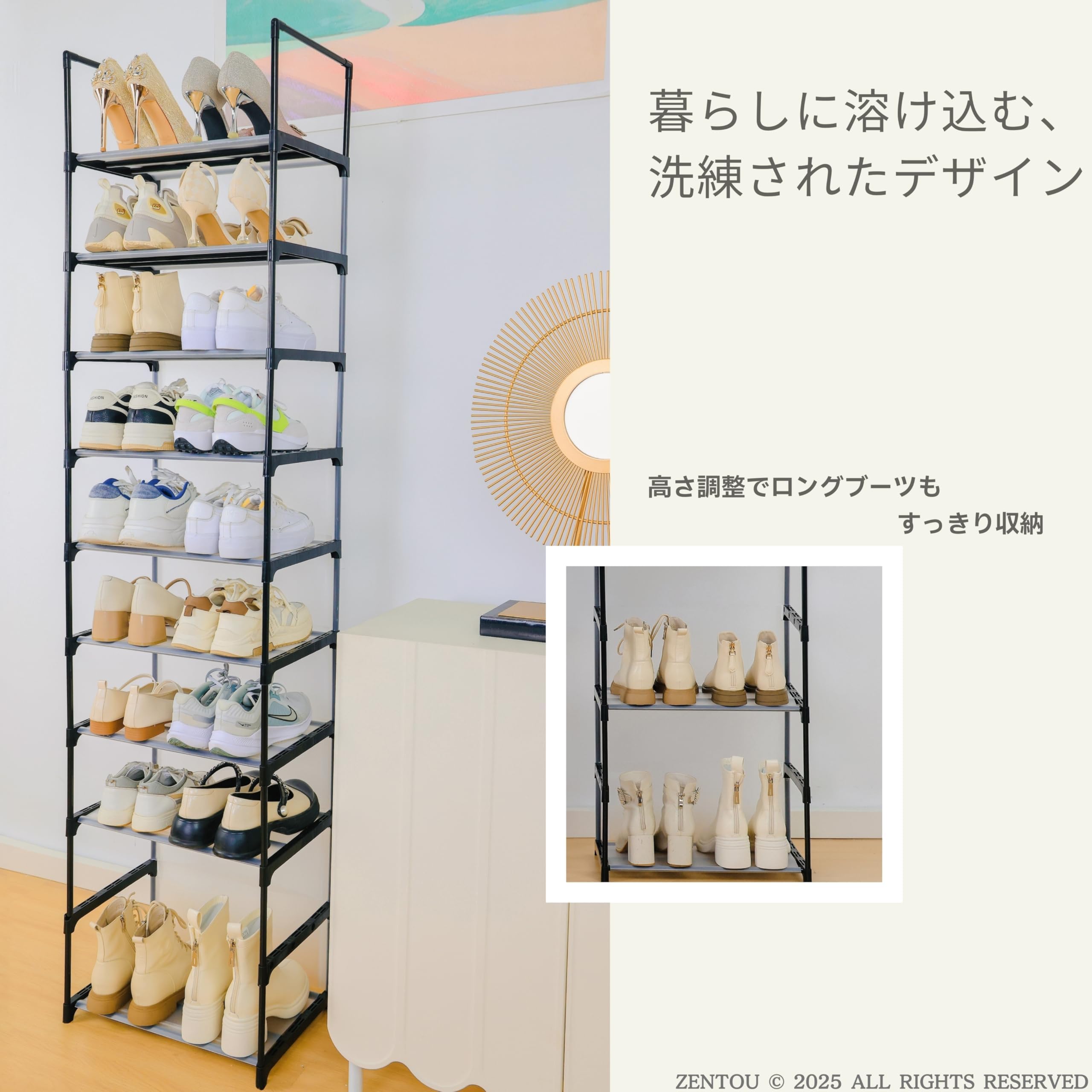 1. 自由に分割・高さ調節可能なシューズラック 本シューズラックは10段構造で、上下自由に分割して、5段+5段などお好みに合わせて使い分けが可能なシューズラック スリムです。中段のスチールパイプを取り外すことで、ブーツやハイカットシューズ、スニーカー収納、長靴収納、靴 ラック スリム、玄関靴箱、シューズ収納としても使えます。限られた空間でも玄関収納や靴しゅうのう、子供用シューズラックとして最適で、シューズ キャビネット、シューズ ラック おしゃれ、靴箱 収納、靴ラック 大容量としても活躍します。