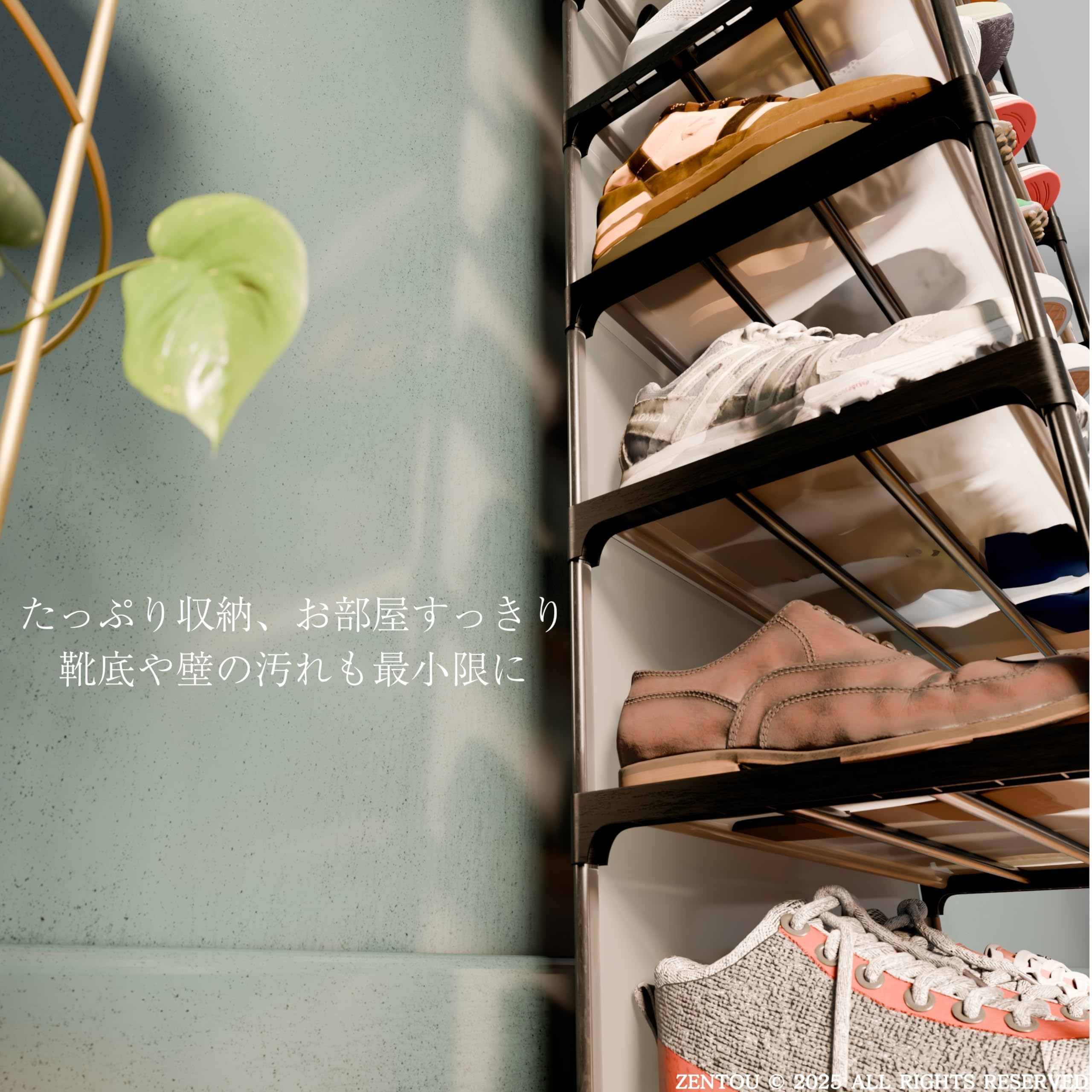 4. 高耐荷重・壁面保護に優れたシューズラック スチールパイプとPPシートでしっかり支え、高耐荷重を実現。靴収納だけでなく、本棚や雑貨収納としても使えるマルチシューズラックです。壁面接触部分にはPPシートを採用し、壁面を傷や汚れから保護します。靴箱やシューズラック おしゃれとしてもおすすめです。子供用靴箱や靴しゅうのう ラックとしても最適です。スリムシューズラックや靴箱 高さ調節可能としても使えます。