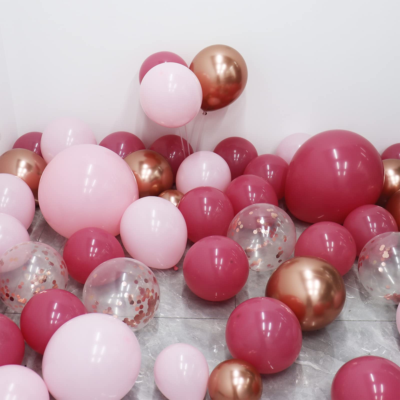 【ユニークなデザイン】: ローズレッド ピンクとデラックス クローム ローズゴールドのトレンドバルーンと、ローズゴールドの紙吹雪バルーンを組み合わせました。 ミニから大型のプレミアム品質のラテックスバルーンまで、互いに補完するバルーンサイズの詰め合わせ。 ベビーシャワー、誕生日パーティー、ウェディングシャワー、記念日などに最適です。