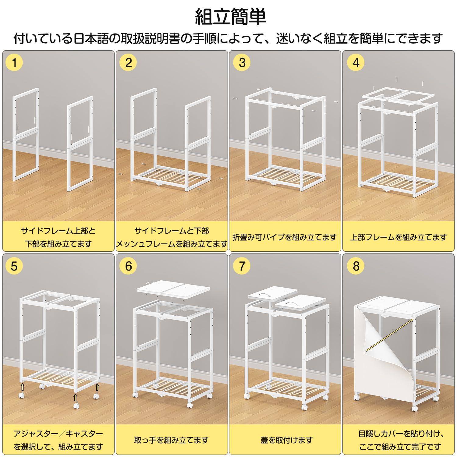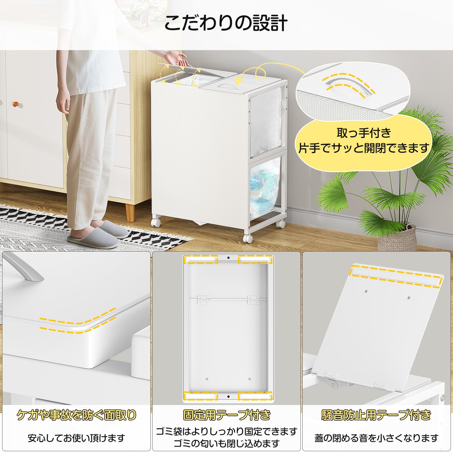 ??【こだわりの設計&製品仕様】取っ手が付いており、蓋は片手でサッと開閉できるポリ袋ホルダーである上、蓋には固定用テープと騒音防止用テープも付いており、ゴミ袋はよりしっかり固定でき、滑り落ちることを心配する必要がなくて、ゴミの匂いもしっかり閉じ込め、空気を綺麗にして、蓋の閉める音も小さくなり、より楽に使用可能な目隠し分別ダストワゴンです。??また、ケガや事故を防ぐ面取りも付いており、安心してお使い頂けます。??商品仕様:キャスタータイプ組立後サイズ:約48.2*32.5*65cm アジャスタータイプ組立後サイズ:約48.2*32.5*61.5cm