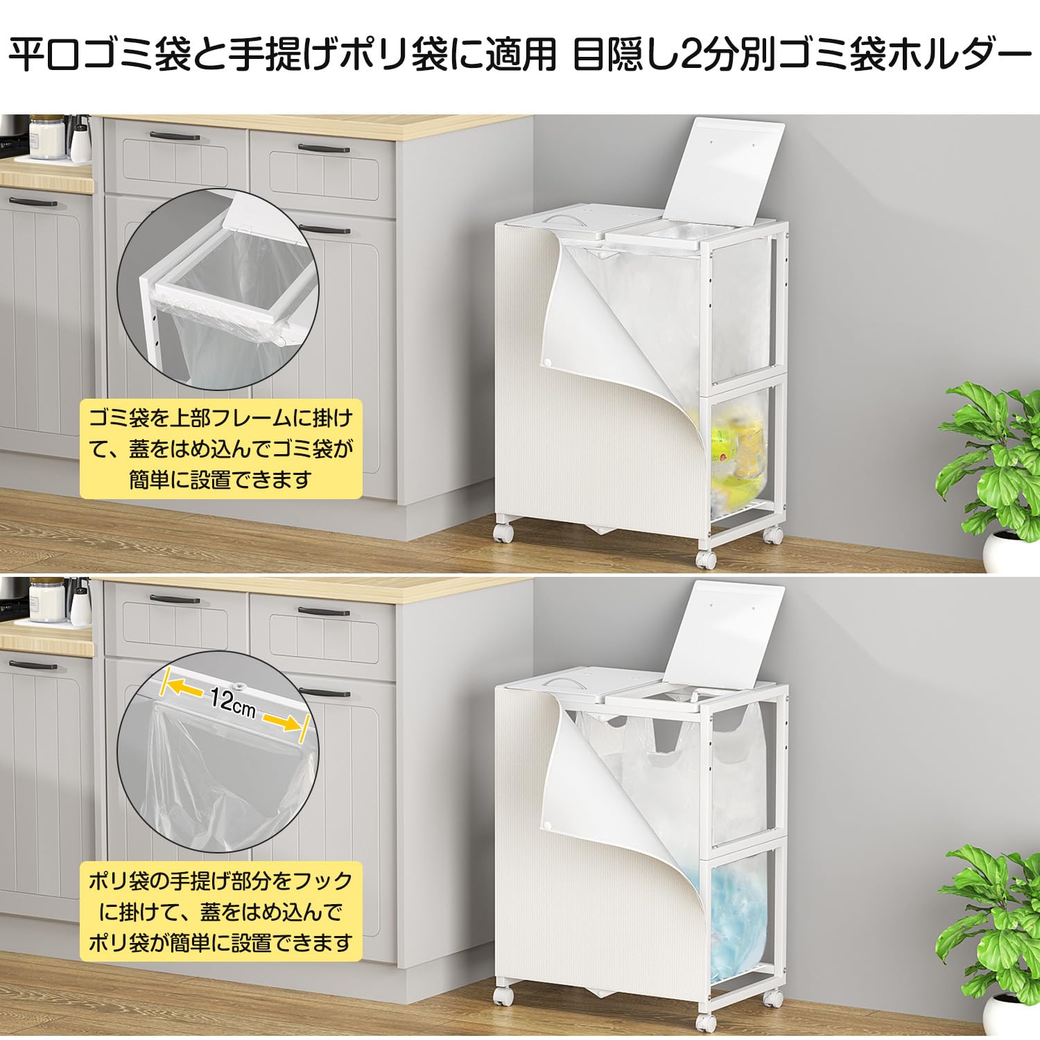 PRTONE ゴミ箱 目隠し 2分別 45L ふた付き ゴミ袋ホルダー ダストボックス キャスター付き 取っ手付き 分別ゴミ箱 おしゃれ スリム 2連 大容量 10L〜55L袋対応 ゴミ袋 スタンド ポリ袋ホルダー 縦開き キッチン 台所 リビング オフィス ダストワゴン ホワイト
