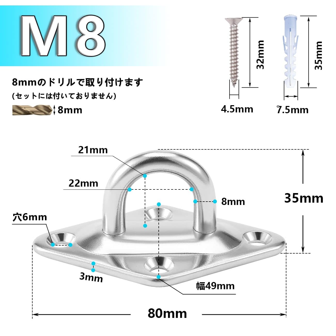 ★【使用荷重】:M8パッドアイの最大使用荷重は300KGです。