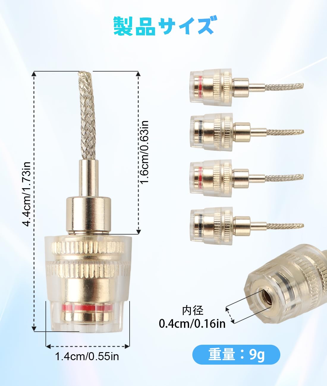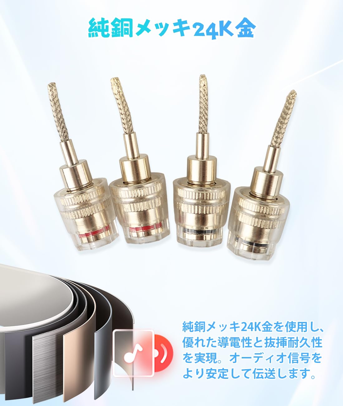 【高品質な端末加工】 スピーカーケーブルの長さは14.0mmと十分な長さがあり、柔軟性に優れています。必要に応じて細く撚ることも可能です。銅線を使用し、24K金メッキ加工が施されたスピーカーケーブルの先端は固められており、複数回抜き差しや撚りを行っても簡単にバラけることはありません。