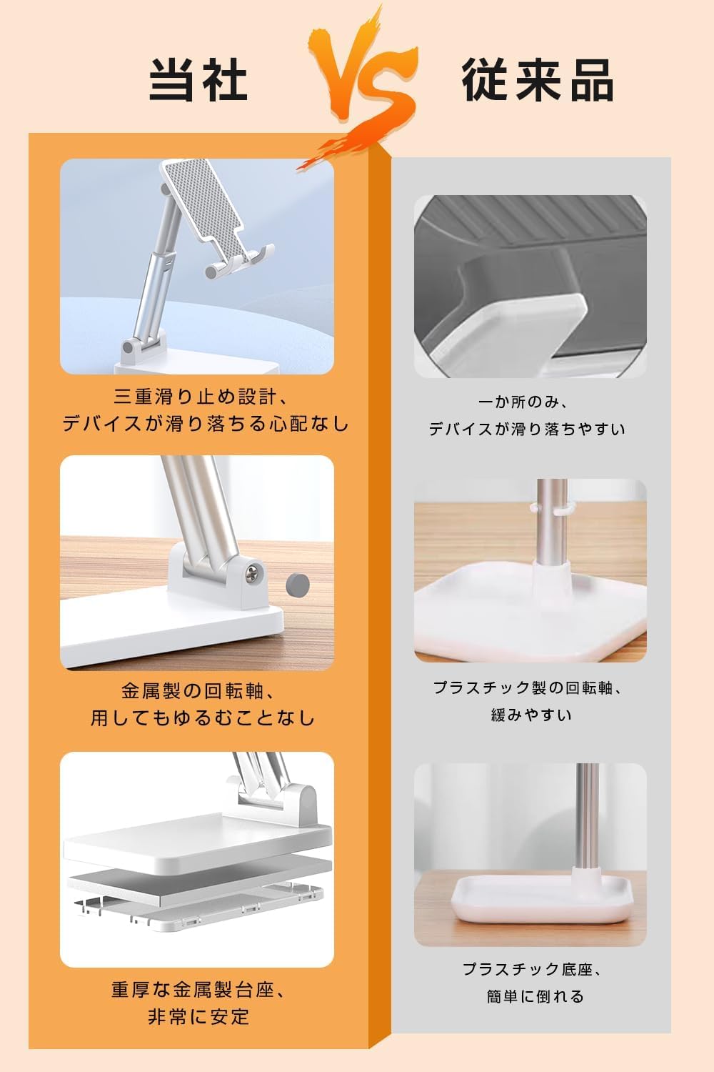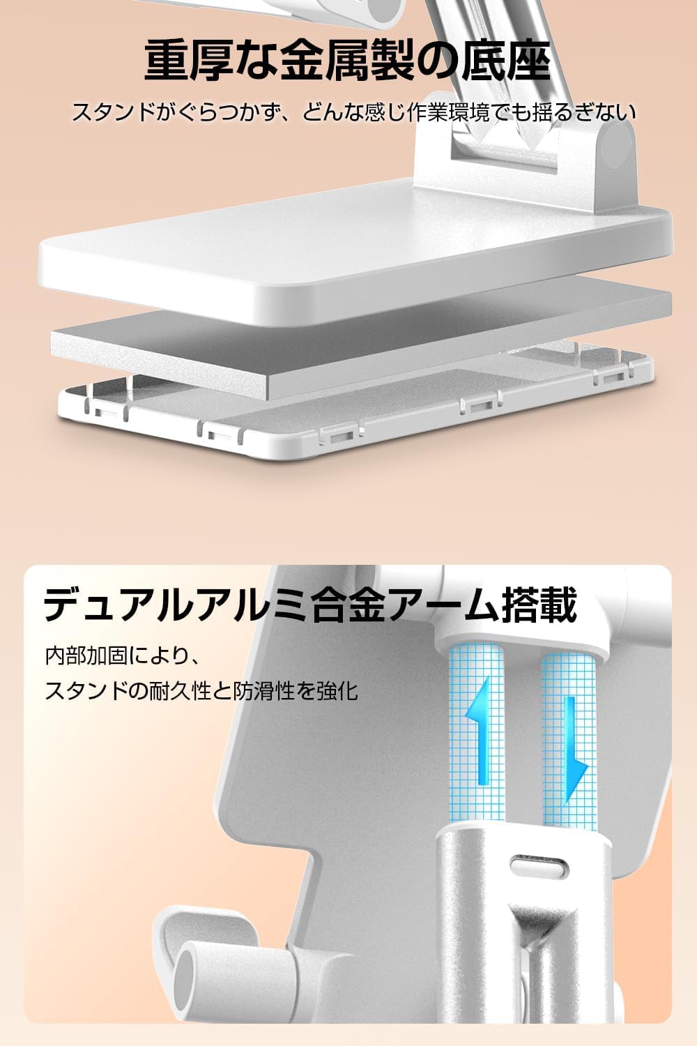 ??【アルミ合金素材で極軽量・安定性抜群】このスマホスタンドは、耐久性と安定性を重視した設計が特徴です。柱には高品質なアルミ合金素材を採用し、軽量ながらも頑丈な構造を実現しています。これにより、長期間使用しても形状が維持され、錆びにくいというメリットがあります。さらに、スマホスタンドの基盤には重厚な金属製の底座が使われており、安定性を大幅に向上させています。この頑丈な金属製の底座は、デバイスを設置した際に倒れにくく、安心して使用できる安定感を提供します。