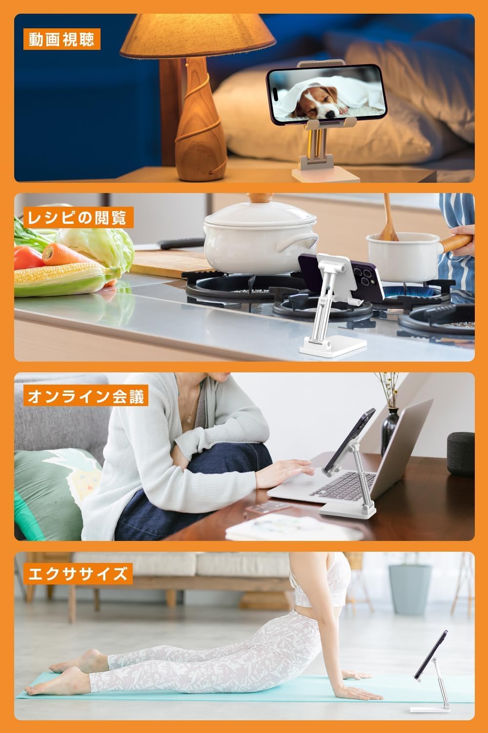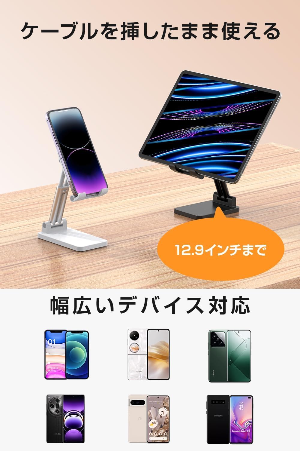 ??【幅広いデバイスに対応】このスマホスタンドは、スマートフォンから大画面のタブレットまで幅広いデバイスに対応し、最大12.9インチ厚さ18mmまでサポートしています。さらに、デバイスに充電ケーブルを挿したままでも使用できるため、長時間の使用や充電しながらの作業がスムーズに行えます。デバイスをしっかり固定し、快適な使用感を提供するこのスマホスタンドは、オフィスや家庭、旅行先でも大活躍します。