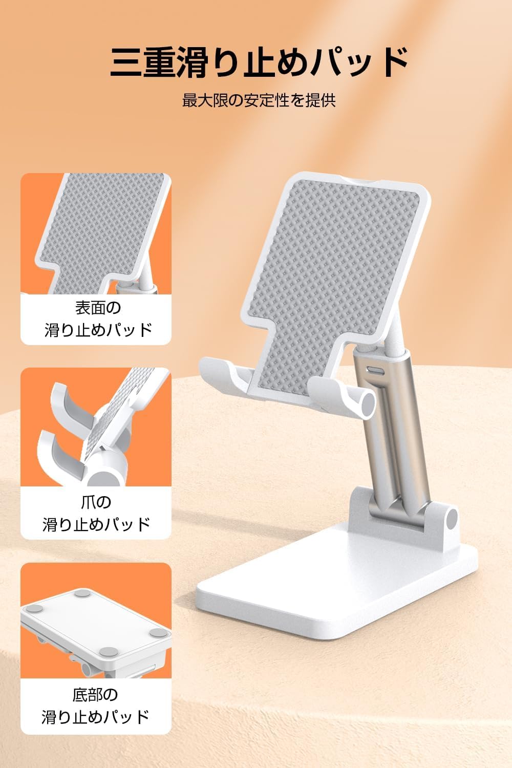 ??【3重滑り止め設計】このスマホスタンドは、最大の安定性を提供する設計が特徴です。表面には滑り止めパッドが施され、デバイスをしっかりと固定します。さらに、爪の部分にも滑り止めパッドがあるため、角度を調整しても安定感が保たれ、使用中にズレる心配がありません。スマホスタンドの底部にも滑り止めパッドが装備されており、机やテーブルの上でも滑らず、安心してお使いいただけます。これらの滑り止めパッドのトリプルサポートにより、どんな場所でもデバイスをしっかりと支え、快適な使用体験を提供します。