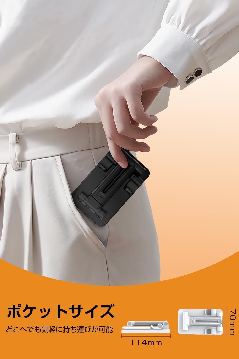 ??【コンパクト・収納便利】このスマホスタンドは、折り畳むと横幅70mm、長さ114mmというコンパクトなサイズになり、まさにポケットに収まる手軽さが特徴です。外出先や旅行中でも、カバンやポケットに簡単に収納でき、いつでもどこでもスマホやタブレットを便利に使用できます。スマホスタンドの持ち運びに困らないこのポケットサイズのデザインは、日常生活やビジネスシーンでも重宝され、快適な使用体験を提供します。