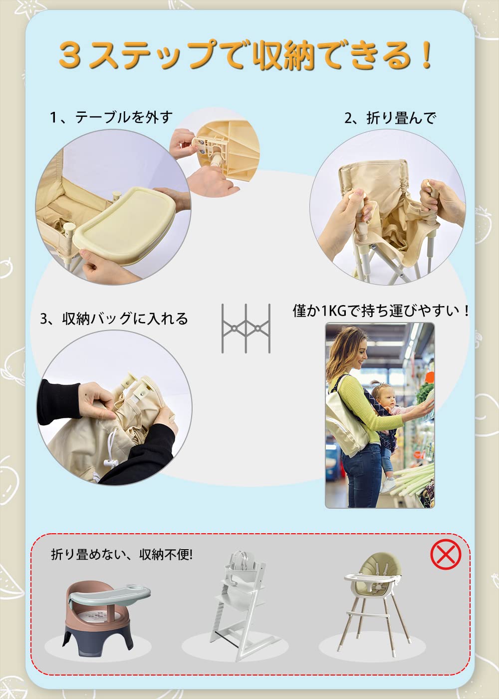 ★収納便利:テーブルを外して、チェアを折り畳んで、収納袋に入れると直ちに出かけられます。わずか1kgの重量は持ち運びやすい。また、収納袋及びベビーチェアではポケットがあり、哺乳瓶や食器や玩具などを収納できます。