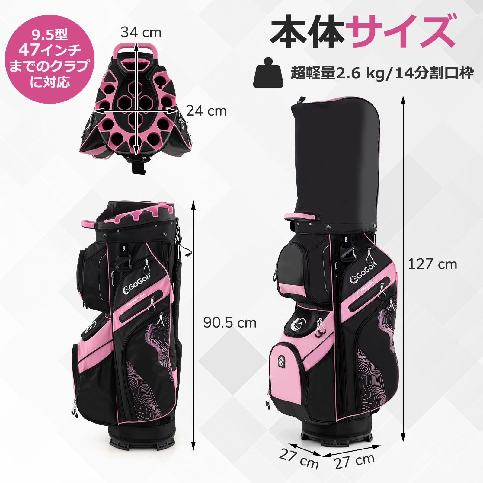 ????♀?【14分割フルセパレート構造】クラブが絡みにくい14分割のフルセパレート口枠を採用しており、1本ずつすっきりと収納できます。最大47インチまでのクラブに対応し、ゆったりとした9.5型サイズでクラブをスムーズに収納できます。さらに、わずか約2.6kgの軽量設計で、上部には持ち手も付いているため、カートへの積み降ろしやセルフプレイでの持ち運びも快適に行えます。