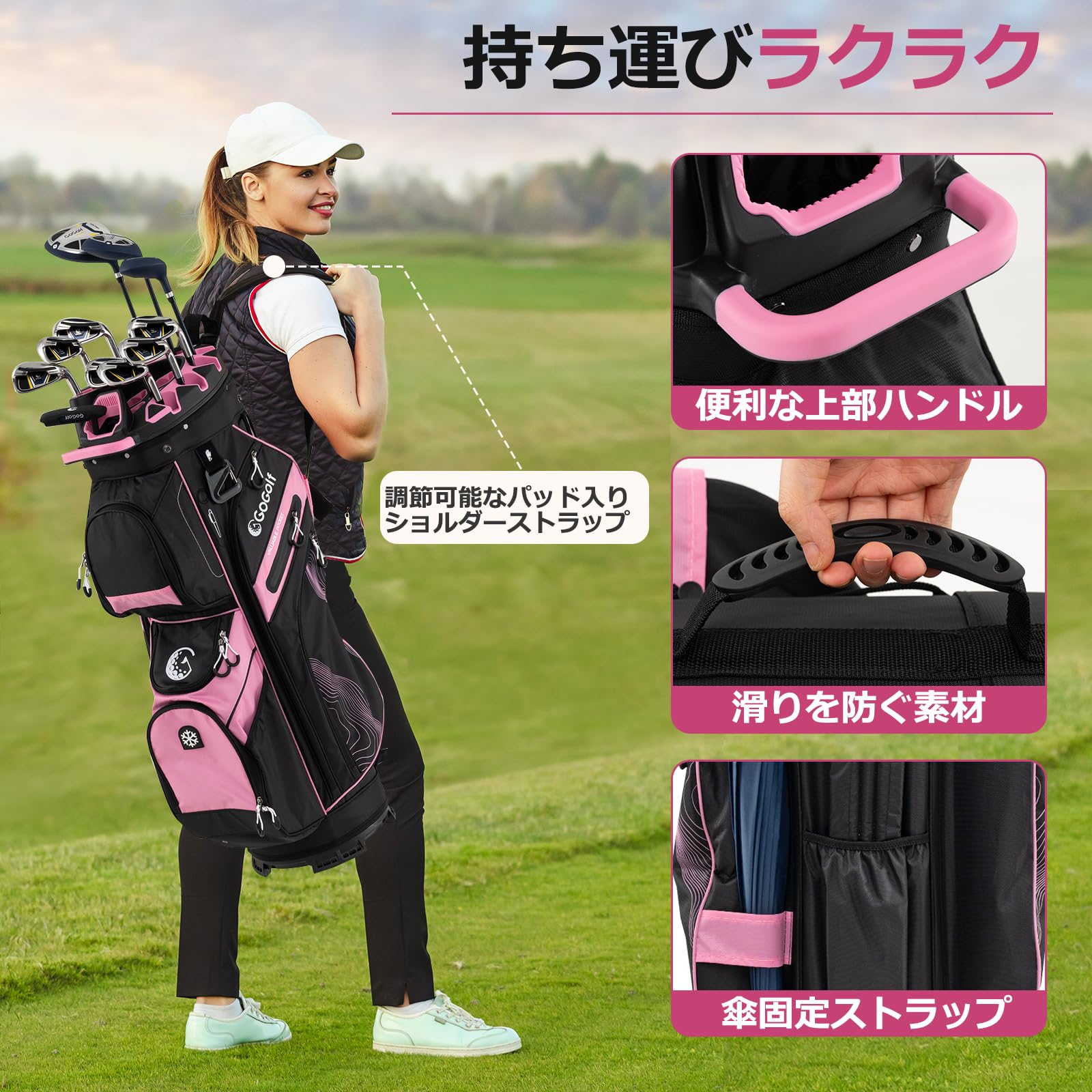 ????♀?【セルフプレイにも最適】バッグ本体は軽量でありながら耐久性に優れており、長時間の移動でも快適に使用できる設計になっています。肩掛け用のショルダーストラップには厚みのあるパッドが入っており、肩への負担を軽減します。使用しないときは背面の専用ポケットにストラップを収納できるため、見た目もスマートな状態を保つことができます。