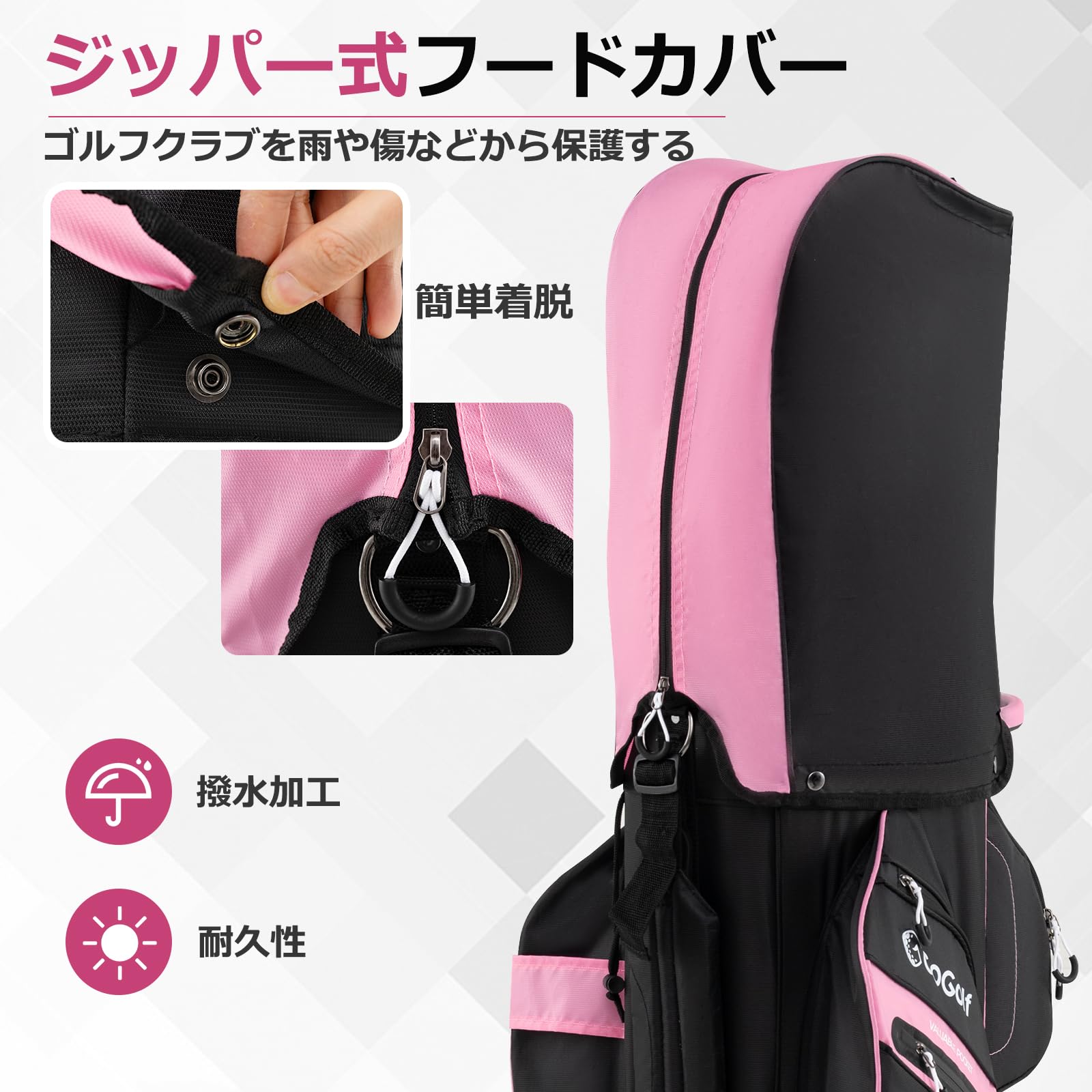 ????♂?【安心の防水仕様】急な雨でも安心してプレイができるよう、雨対策に撥水性の高い生地を使用しています。さらに、ジッパー付きのフードカバーが付属しており、クラブ全体をしっかり保護することができます。傘ホルダーも搭載されているため、雨天時にも対応しやすく、突然の天候の変化にもしっかり備えることができます。