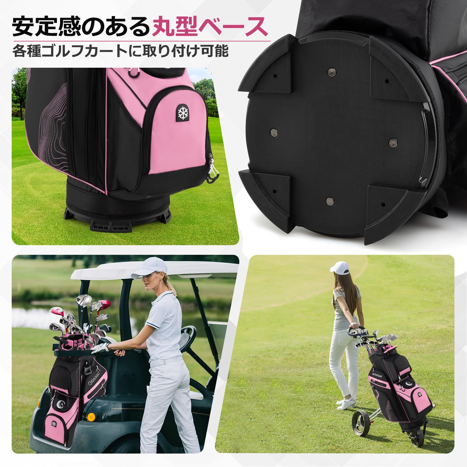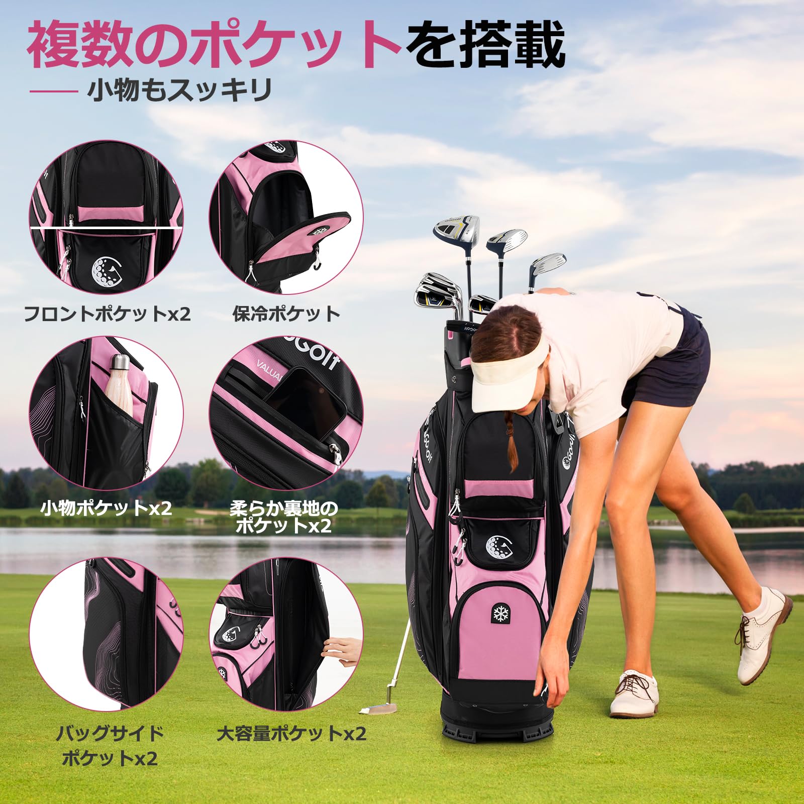 ????♂?【使いやすい11ヶ所の収納付き】飲み物を入れられる保冷ポケットや、貴重品を守る裏地付きの収納など、使いやすいポケットを11ヶ所備えています。季節によって必要なものも無理なく収納できるため、ラウンド中も荷物がすっきりまとまります。また、タオル、傘、手袋用のホルダーも付いており、プレー中にさっと取り出せて便利です。