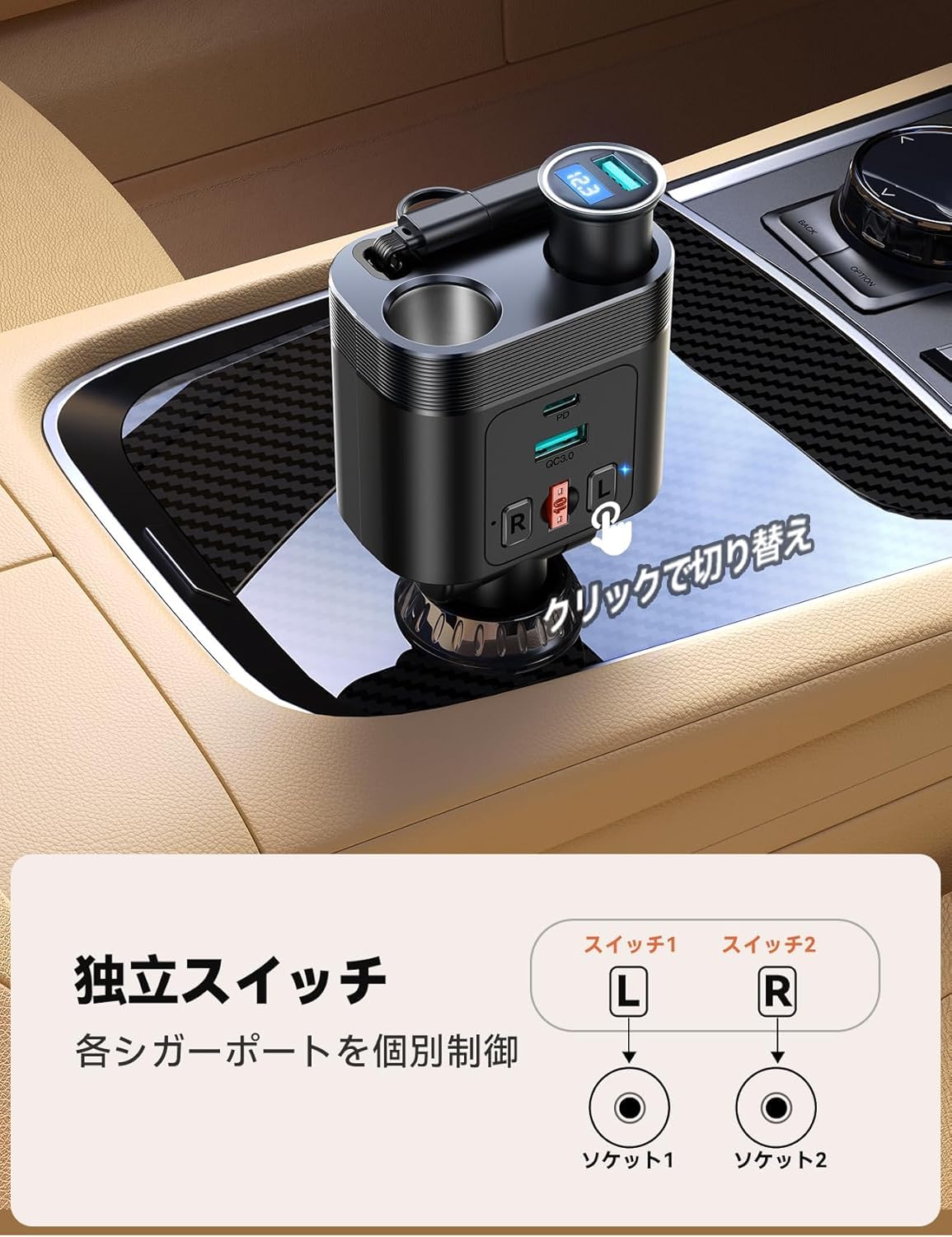 【独立スイッチで便利&省エネ】 増設シガーソケット部分には、2つの独立したスイッチを搭載します。左右のソケットそれぞれに柔らかなLEDインジケーターが付き、使用状況を一目で確認できます。使用しない時は電源をオフにすることで、デバイスの抜き差しを減らし、便利性と安全性を高めます。