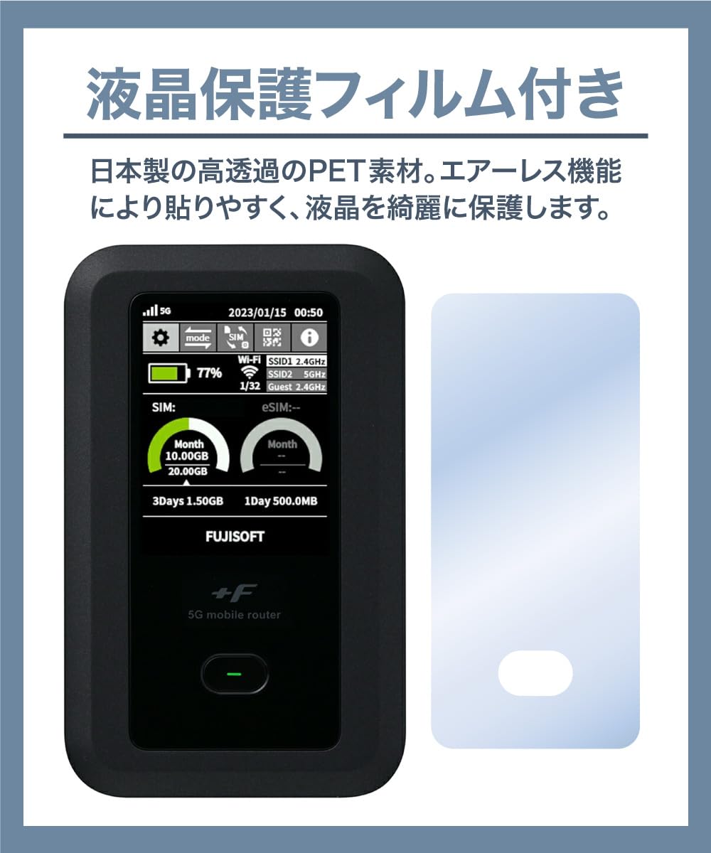 【付属品も充実】 伸縮性に優れたシリコン製のストラップ付きで、金属やプラスチックを使用せず、ルーターを傷から守ります。さらに、日本製の液晶保護フィルムもセットで提供。高透過PET素材で気泡が入りにくく、初心者でも簡単に貼れる仕様です。