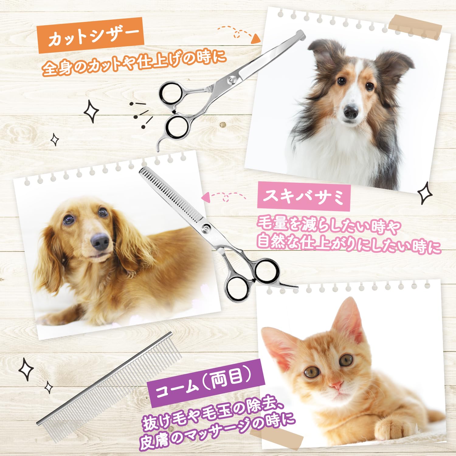 ?【使用対象】トリミング道具はペットの種類や用途によって使い分けていただくことを推奨しております。●スキばさみは主に、毛量を減らしてすっきり見せる時に使用します。ダックスフンド、パピヨン、キャバリアなどに適しています。●部分カットばさみは、細かい箇所をカットするのに使用します。プードル、シーズー、シュナウザー、ネコちゃん全般、ウサギちゃんなどの小動物などに適しています。●全身カットばさみは、主にワンちゃんの全身や背中をカットしラインを出したいときに使用します。●カーブばさみは、丸みのあるカットラインに仕上げたいときに使用します。主にプードル、シーズー、マルチーズなどに適しています。●くしは全犬、猫、小動物に使用可能です。