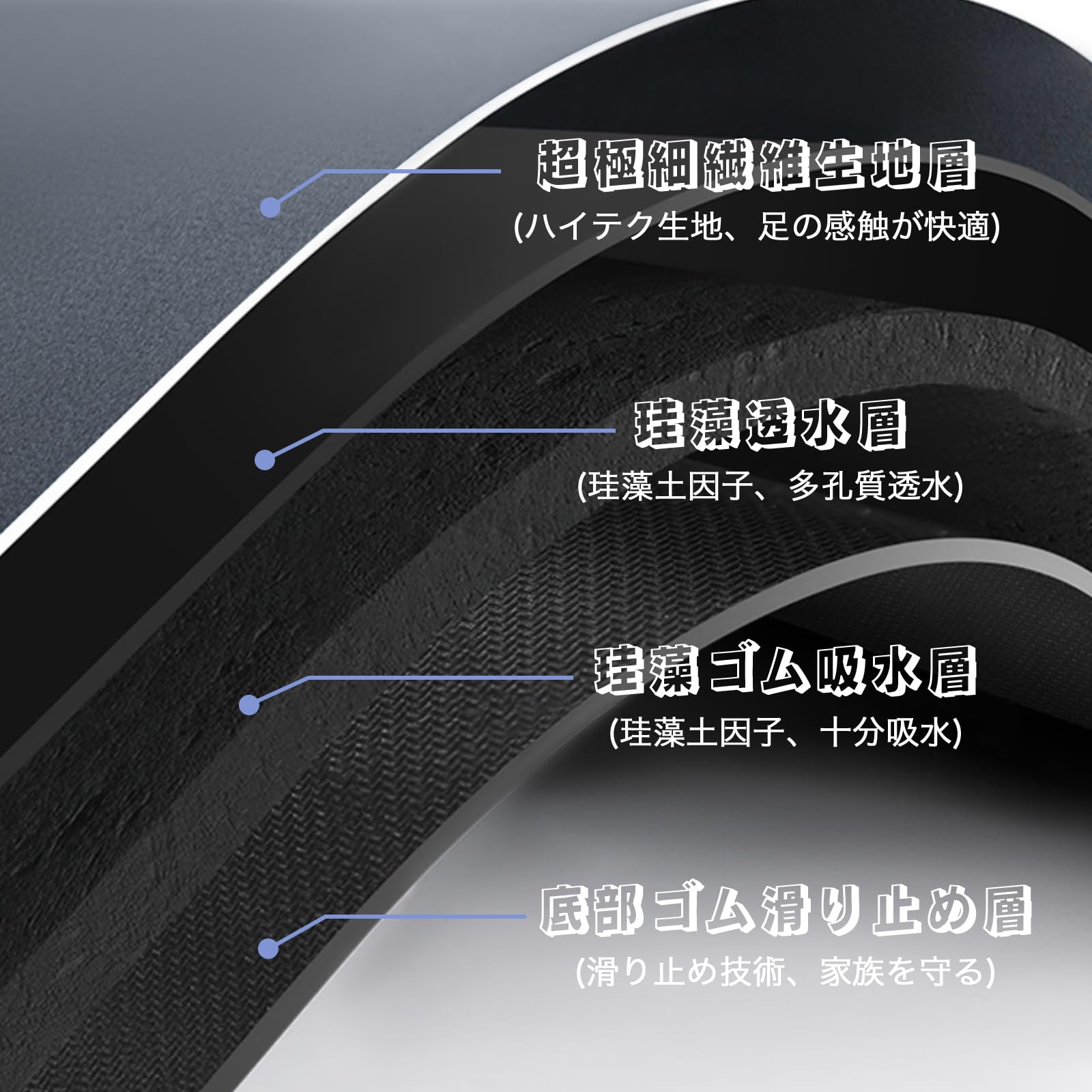【4層構造】マイクロファイバーテクノロジーファブリック層(テクニカルファブリック、快適な踏み心地)、珪藻透水層(多気孔、第1層は水を吸い込み、水分の浸透を助ける)、珪藻ゴム吸水層(十分に水を吸い込む)、底部ゴム滑り止め層(特殊滑り止め技術は安全を保障する)があって、使いやすいです。