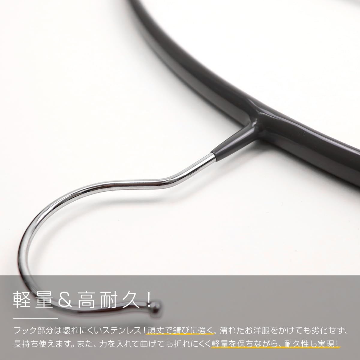 【Point.03 軽くて丈夫!】フック部分は壊れにくいステンレス。頑丈で錆びにくく、濡れた洋服を掛けても劣化しにくく、長くご使用いただけます。