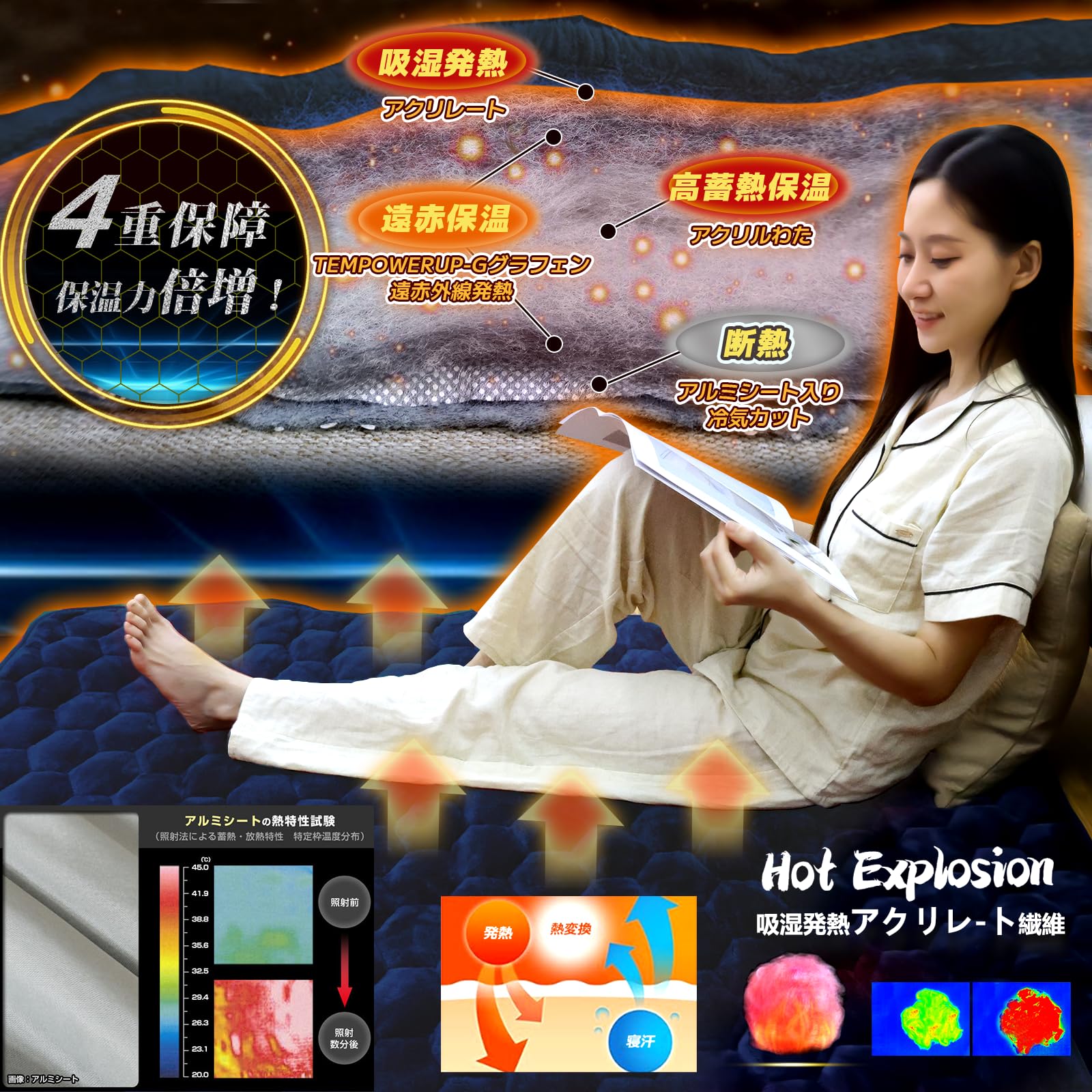 『熱を逃がさない3重保障保温』①奇跡の素材と呼ばれる「グラフェンTEMPOWERUP-G」をたっぷり配合し、中わたの偏りを防ぎつつ熱を逃がさない六角形キルト模様を採用。極めて高い熱伝導性、熱伝導率を数十〜数百倍に向上することも可能です。②「超蓄熱保温★アクリル中わた使用」通常のポリエステル綿より暖かく、ふわふわとしたウールのような質感で、体から出る暖かい空気を閉じ込め、保温力が一番。③『冷気ガッド 断熱アルミシート』体温を反射することで熱を閉じ込め、高い保温性を実現。