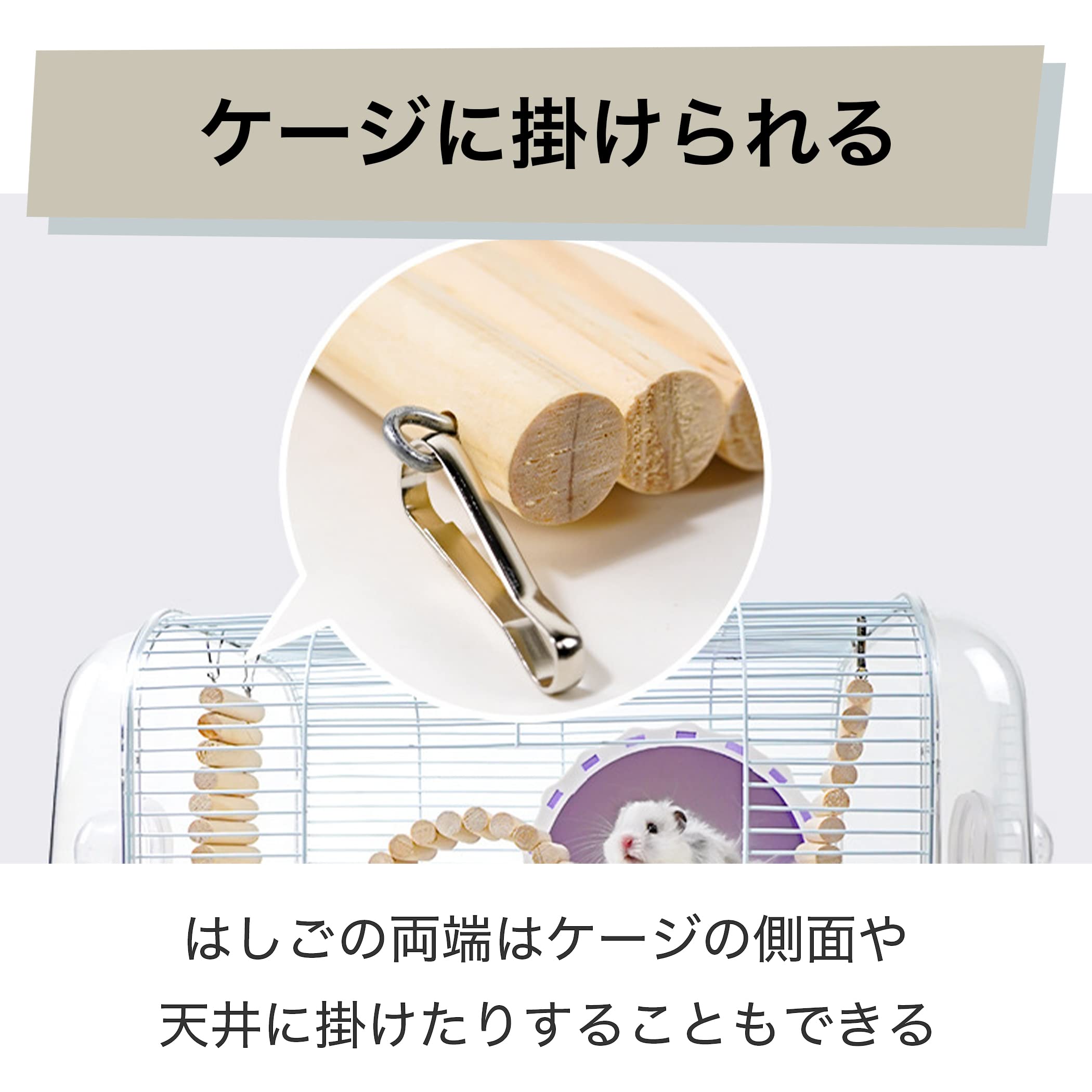 両端をケージに掛けられる:はしごの両端はケージの側面や天井に掛けたりすることもできます。アイデア次第でさまざまな使い方ができる点が魅力的です。S字やアーチ状など、お好みの形に変化させて設置してみてください。