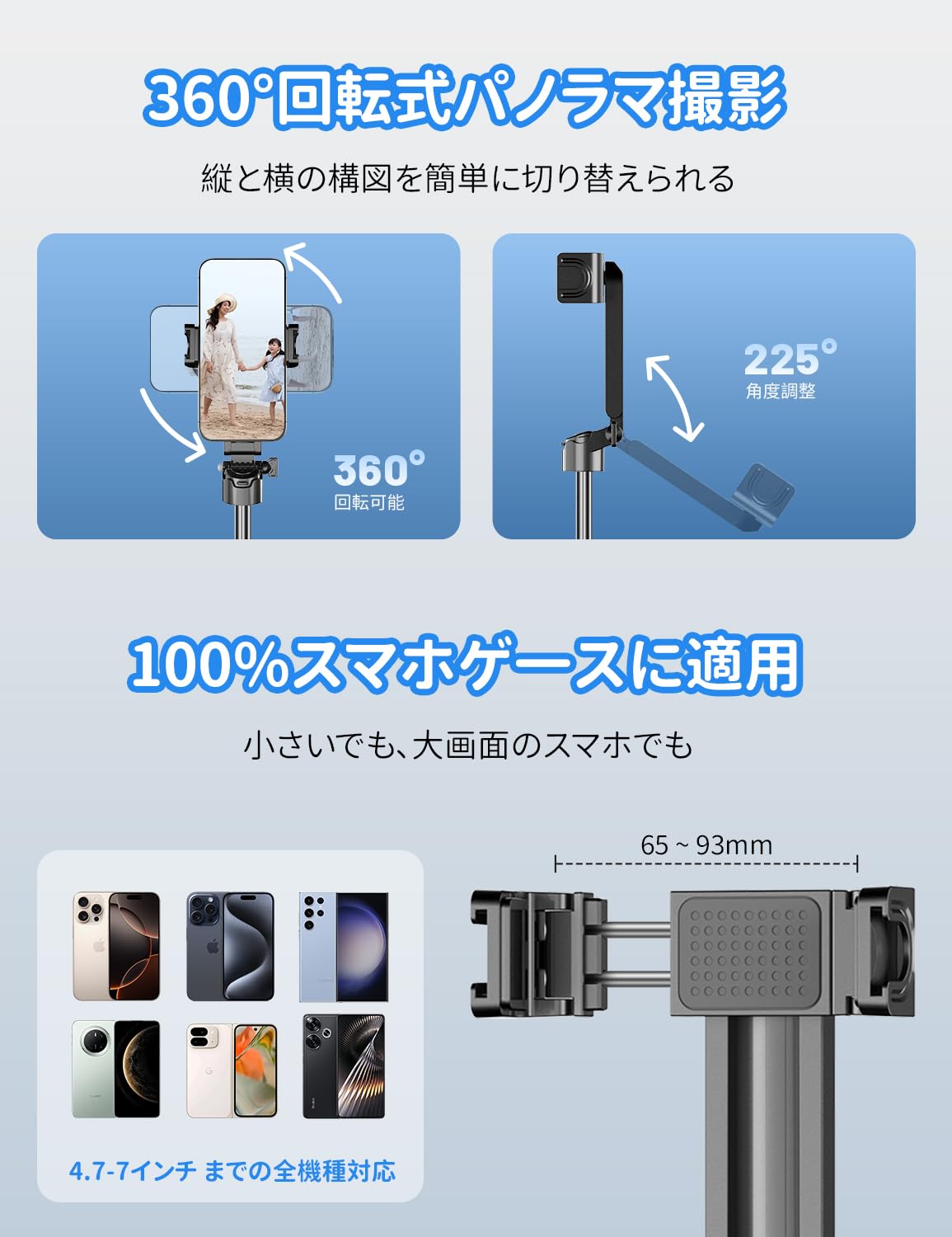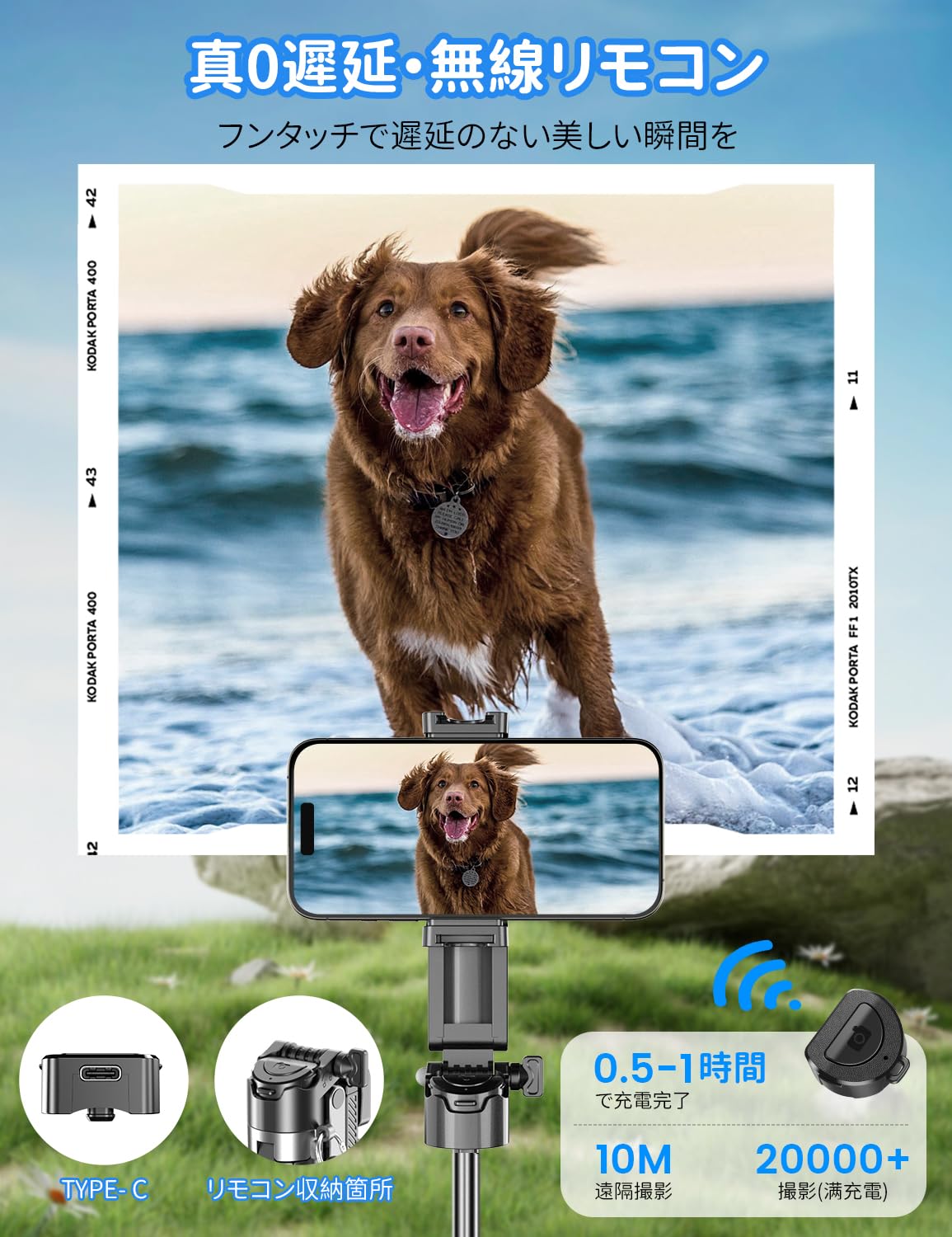 【リモコン操作とコールドシュー】二つコールドシューマウントが付き、マイクやLEDライトを取り付けることができます。取り外し可能なBluetoothリモコンは、真0遅延撮影、シャッターを押すだけで最遠10mまで操作できます。他人からの協力なしで一人で遠距離撮影を実現できます。セルカ棒は業界最先端Bluetooth5.2技術を採用、3秒に瞬間接続可能、一度接続したスマホをリモコンが自動記憶して、次回から自動的にペアリングできます。リモコン対応スマホ機種:iOs4以上&Android 8.0以上。Bluetoothが接続してもスマホシャッターが反応しない場合について、スマホシャッターのデフォルト設定がボリュームキーであるかどうかをぜひ確認してください。