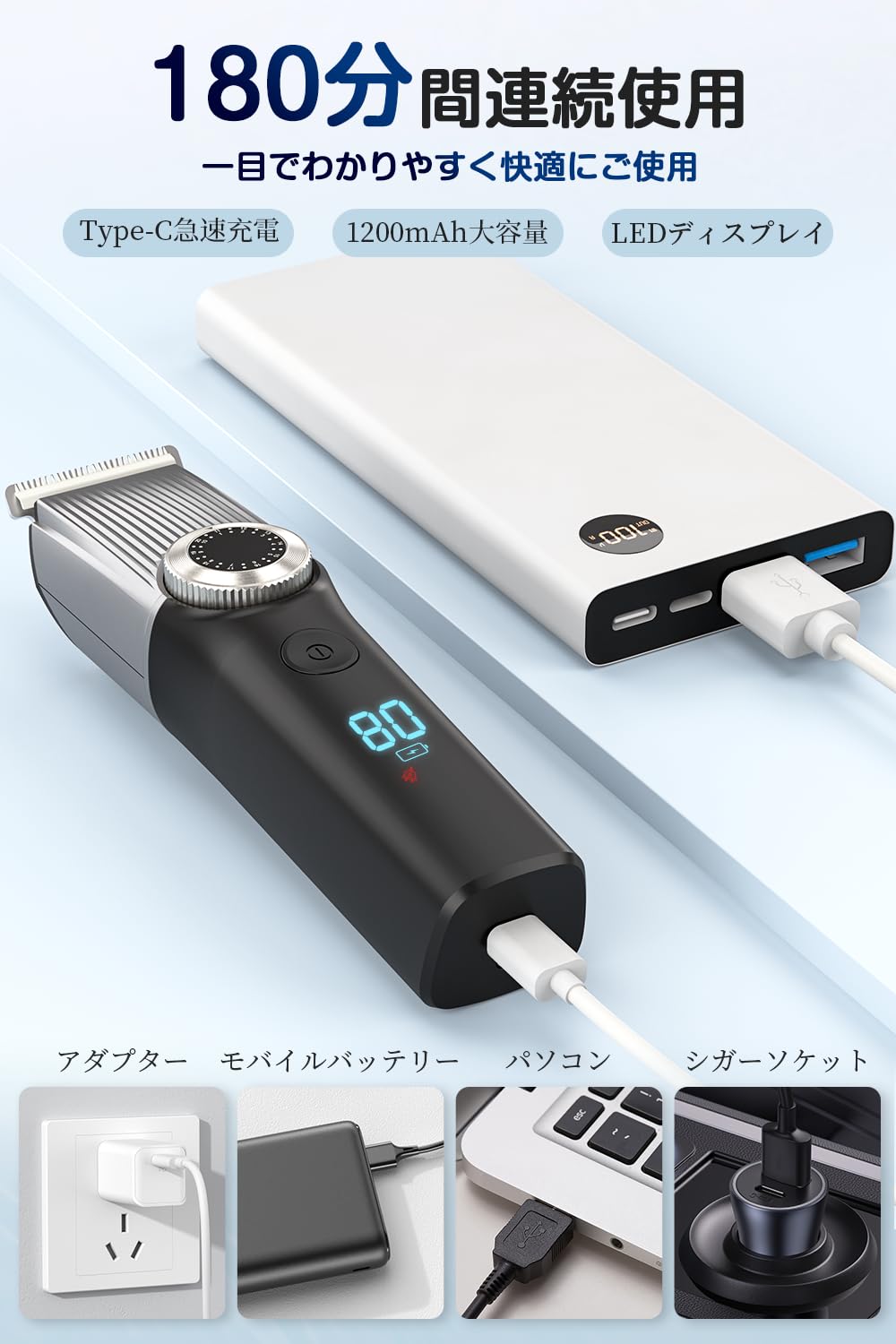 【Type-C充電式&LEDディスプレイ】Type-C充電式 髭 バリカン で、フル充電で180分間の連続使用が可能。コードレス設計で場所を選ばず、充電しながらの使用も可能です。LED液晶ディスプレイで、バッテリー残量、充電状況などの情報が表示され、一目でわかりやすく快適に使用できます。急速充電機能も付き、約5分間の急速充電で1回のヒゲを剃れます。