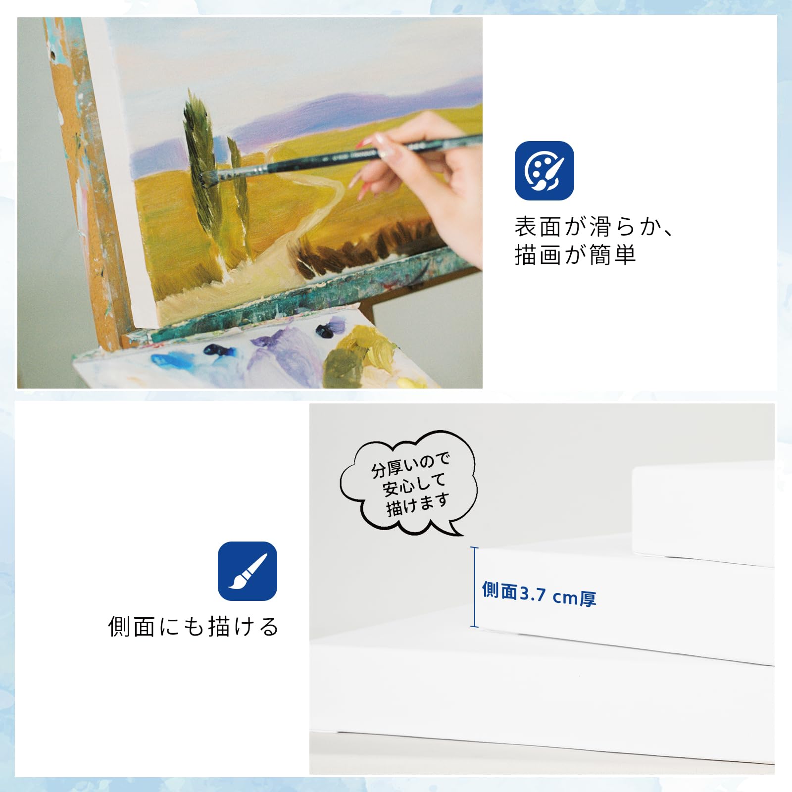 【側面にも描ける】3.7cmの厚みで、キャンバスの側面に描くことで絵画に面白みを添えることができます。