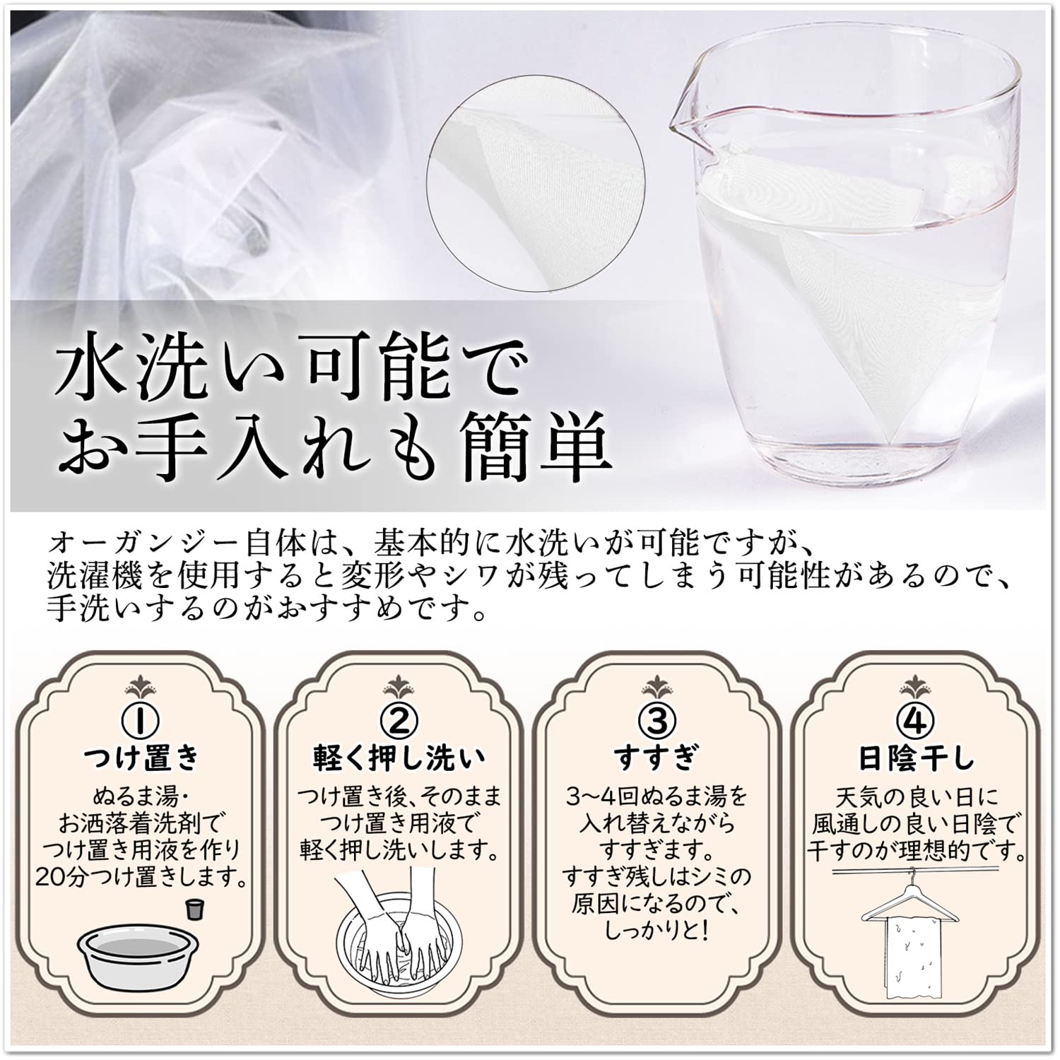 オーガンジー自体は、基本的に水洗いが可能ですが、洗濯機を使用すると生地の変形や強いシワが残ってしまう可能性があるので、手洗いするのがおすすめです。脱水も短めにし、天気の良い日に陰干し乾燥が理想です。