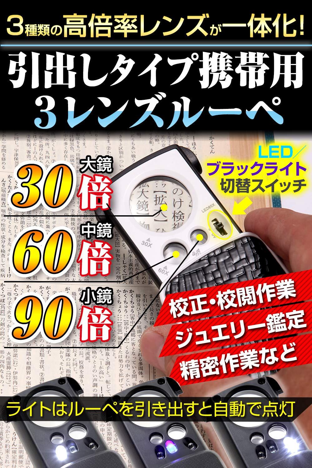ジュエリー鑑定 校正・校閲用 携帯ルーペ【30倍&60倍&90倍】3種類レンズ/LEDライト/ブラックライト付き (ブラック)