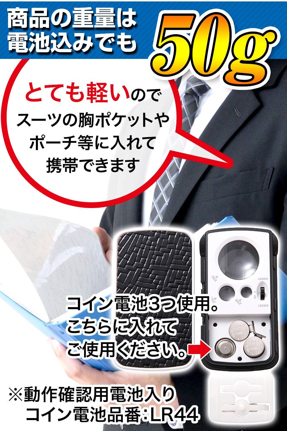 ?【サイズ】縦幅13.3cm×横幅4.6cm、厚み1.8cm レンズ直径大2.5cm、中1.2cm、小8mm 【商品重量】50g(電池込み) 仕様電池はボタン電池3つです。(LR44)※動作確認用電池入りです。